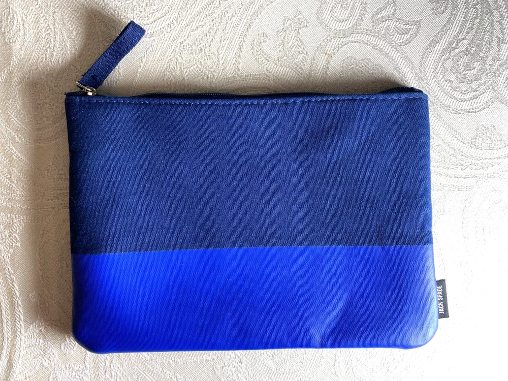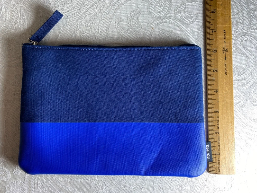 Handle/Strap Material: Canvas Material: Polyester, PVC, Mixed Materials Features: Padded, zipper closure Vintage: No Occasion: Business, Casual, Travel Brand: JACK SPADE Bag Depth: .5 in Theme: Travel, toiletry, overnight, weekender, grooming kit, New York Bag Height: 6 in Color: Blue Seller Notes: “Clean, empty bag” Style: Clutch Pattern: colorblock Closure: Zip Lining Material: Canvas Bag Width: 9 in Department: Men Size: Small