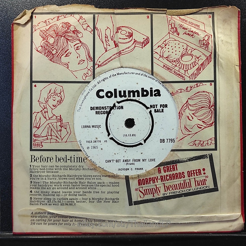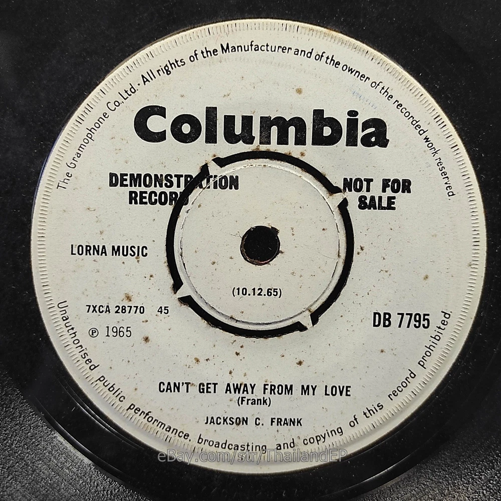 Description Records !!! DETAIL SONG and ARTIST !!! Side : A = Jackson C. Frank - Blues Run The Game / B = Jackson C. Frank - Can't Get Away From My Love Label : Columbia Cat-No : Db 7795 / Year = 1966 Rock, Funk / Soul, Pop-Beat, Mod, Soul Label&Catalogue number : : DB 7795 Country of release : UNITED KINGDOM Condition (Sleeve/Disc) : VG / VG+ Old stock look like Never beed played and pls see picture too. Shipping I am seller in Thailand not USA.So I can not ship 4$ as policy pls understand this real rate from oversea . Price for shipping(Airmail )&Packaging to worldwide only US 14.99 USD .Except Asia and JAPAN only 14.99 USD. You can save cost for combine shipping only 3 USD$ per each. 2xEP=17.99 USD$ , 3xEP=20.99 USD$ . My package very safety by big cardboard don't worry about your's EP/PS/LP. Time delivered 21-45 days . ***All item : have tracking system no need add money*** **For normal shipping (Airmail).Time delivery to ITALY maybe use 1-2 Months, France use 1-2 Months.But Don't worry item will arrived to you sure!!.For fastest and High value you can use Express Mail Service cost for1 EP =39 USD.EP will arrived to you within 5-7 Days. ***All shipment have fully tracking system *** Payment PAYMENT : I accept the follow payment by eBay managed , . My ID eBay provide by eBay .Account will be provide at the end auction.Charges to be covered by winner. If you have question pls email to me anytime i can answer immediatly. I have many EP,PS 7" Thailand Pls Click => View seller's other items Check my feedback , I care and honest all customer.I welcome 0 feedback but contact me first if you will bidding. Good Luck !!!! and Enjoy . 45 RPM / EP/ LP Grading Scale: Mint /NM/ Excellent(VG++) /VG+/ VG /G+ /Good(G) / Fair / Poor / Bad (According Record Collector Magazine (UK)) LOT200-38DB7795