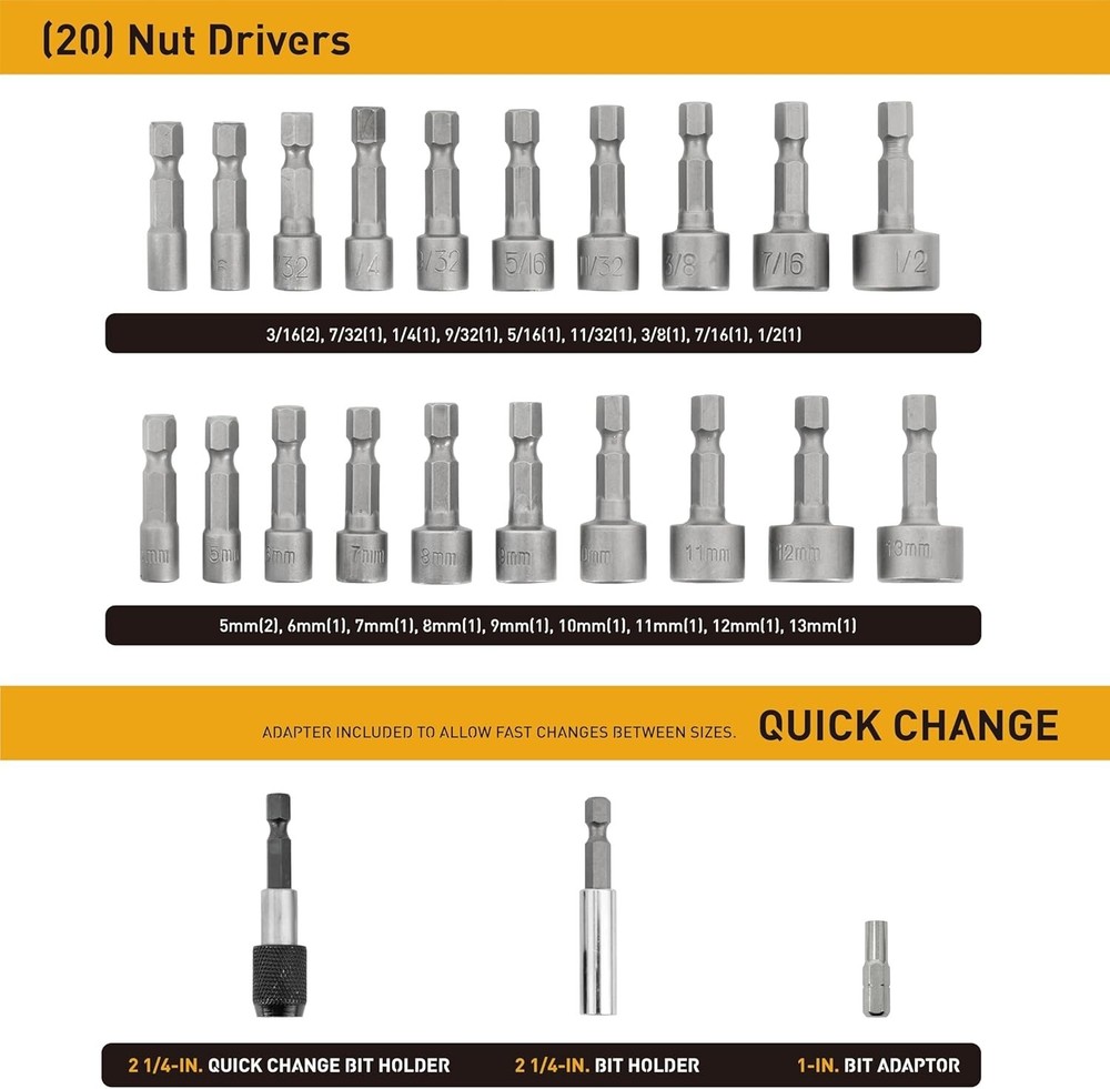 The Ultimate Set: 236 pieces including Nut Drivers, Security Bits, Torx, Slotted, Phillips, Square, Pozi, Hex, Socket, microbits, and other specialty bits in commonly used sizes. Also includes Magnetic Bit Holder, Quick-Change Adapter for fast and easy switching between sizes, a ratchet wrench, and a flexible shaft bit holder for working in hand to reach spaces! Exceptional Quality: Bits are made of high-grade carbon steel (50BV30 & 6150 Grade) and sand-blasted for optimum strength and longevity. Built For Work: Comes in a sturdy, hard-shell case with labeled slots to keep bits organized. Includes multiples of the most common sizes so you can keep working. Practical and Versatile: Use with your drill or impact driver - perfect for DIY projects, with professional results. Use for household maintenance and repair, and so much more. Including hard-to-find sizes and driver configurations, this bit set contains every tool necessary to tighten and loosen every fastener in and around the home.