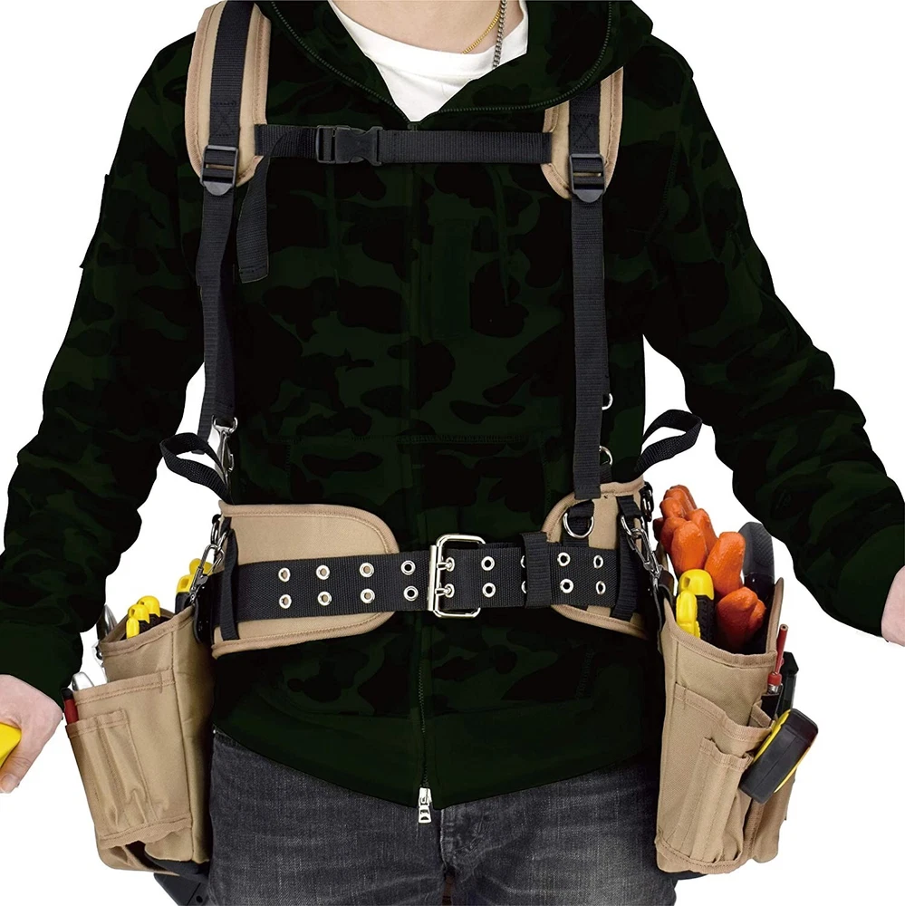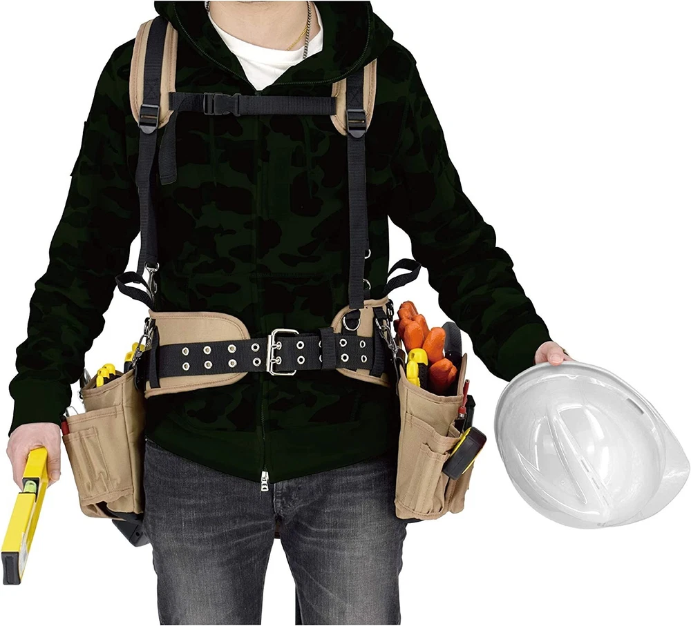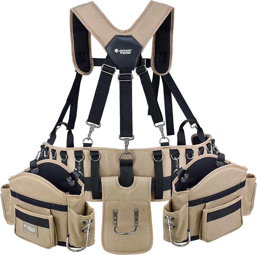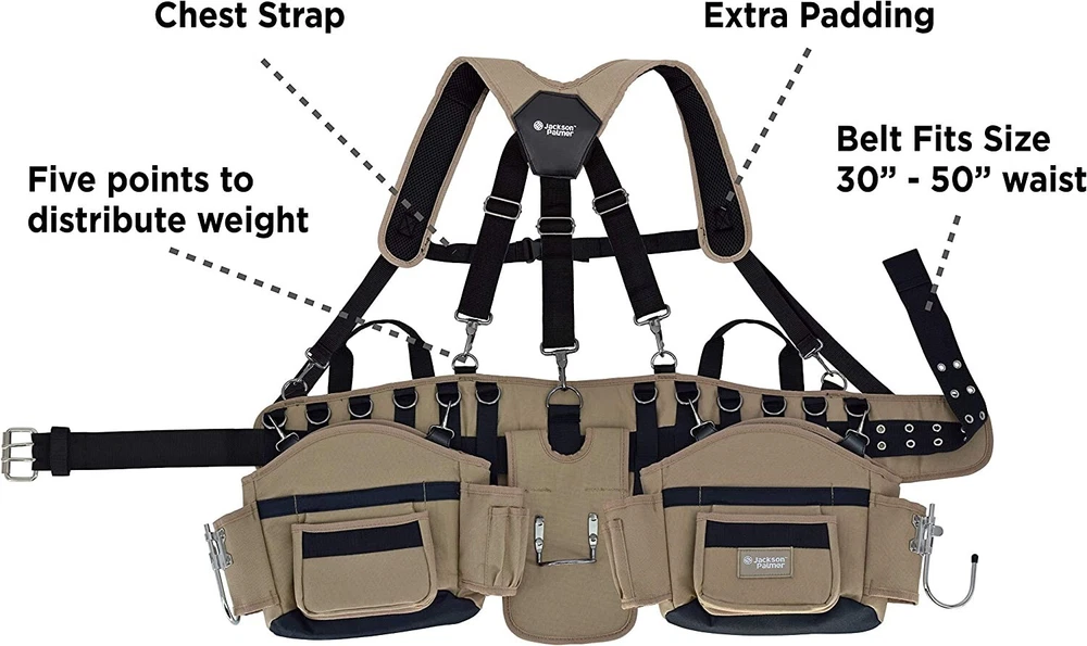 Jackson Palmer Professional Comfort-Rig Tool Belt With Suspenders Adjustable About this item Durable Design: We pored over reviews of existing tool belts and designed ours based off of real user ideas and feedback. Iron buckles and reinforced stitching at key stress points make this belt ideal for tough jobs. Comfortable, Customizable Fit: Adjustable suspender straps and 5-point connection for even weight distribution. Shoulder straps have enhanced padding and cooling mesh for ultimate breathability. Key Features: Hammer holders and two large pouches to keep your tools organized. Made For Any Job: This tool belt is perfect for a wide variety of professionals including electricians, handymen, carpenters, framers, and more. The perfect belt for roofing, construction, or DIY projects. Guaranteed: Try our tool belt with no risk and 100% money back – no questions asked. Product description 2 POWER TOOL HOOKS Each detachable pocket has a power tool hook, perfect for holding your drill or impact driver. Also includes one hammer holder on the back of the belt for easy access. REINFORCED STITCHING We pored over thousands of reviews of existing tool belts and designed ours based off of real user ideas and feedback. Our crowdsource designed belt has reinforced stitching at key stress points and durable iron buckles to make this belt ideal for tough jobs. PADDED STRAPS Enhanced padding back and chest straps with cooling mesh for optimal breathability. Front chest clip and straps are adjustable and grommet belt fits 30" - 50" waist. SHIPS COMPACT Belt is shipped folded and packed to optimize for e-commerce. We recommend hanging the belt for 24 hours to regain its shape before loading it with tools. From the band The Jackson Palmer collection was created as a work site brand that stands for hard work, reliability and trust. Combining quality craftsmanship with premium materials, all of our products are built tough and built to last. Our mission is to create products that are durable, practical and affordable. We start by listening to our customers to understand their needs and solve common problems with simple innovations. Shipping We offer FREE shipping on all orders! We ship within Three business days of payment, usually sooner. We use a selection of shipping services such as UPS, FedEx, USPS etc. We only ship to the lower 48 states, no APO/FPO addresses or PO Boxes allowed. Local pickups and combined shipping options are not provided at this time. Return You can return a product for up to 30 days from the date you purchased it. Any product you return must be in the same condition you received it and in the original packaging. Please keep the receipt. Payment We accept payment by any of the following methods: PayPal Please pay as soon as possible after winning an auction, as that will allow us to post your item to you sooner! Feedback Customer satisfaction is very important to us. If you have any problem with your order, please contact us and we will do our best to make you satisfied. Contact Us If you have any queries, please contact us via ebay. We usually respond within 24 hours on weekdays. Please visit our eBay store to check out other items for sale! Thank you for shopping at our store.