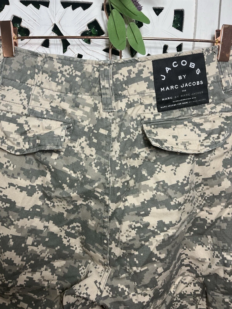 Jacobs by Marc Jacobs Men’s Camo Utility Military Cargo Cotton Shorts Size 27-31. Great Pre-loved condition. Approximate measurement laying flag waist 16 rise 13 hips 22.5 inseam 10.5 length 23.5