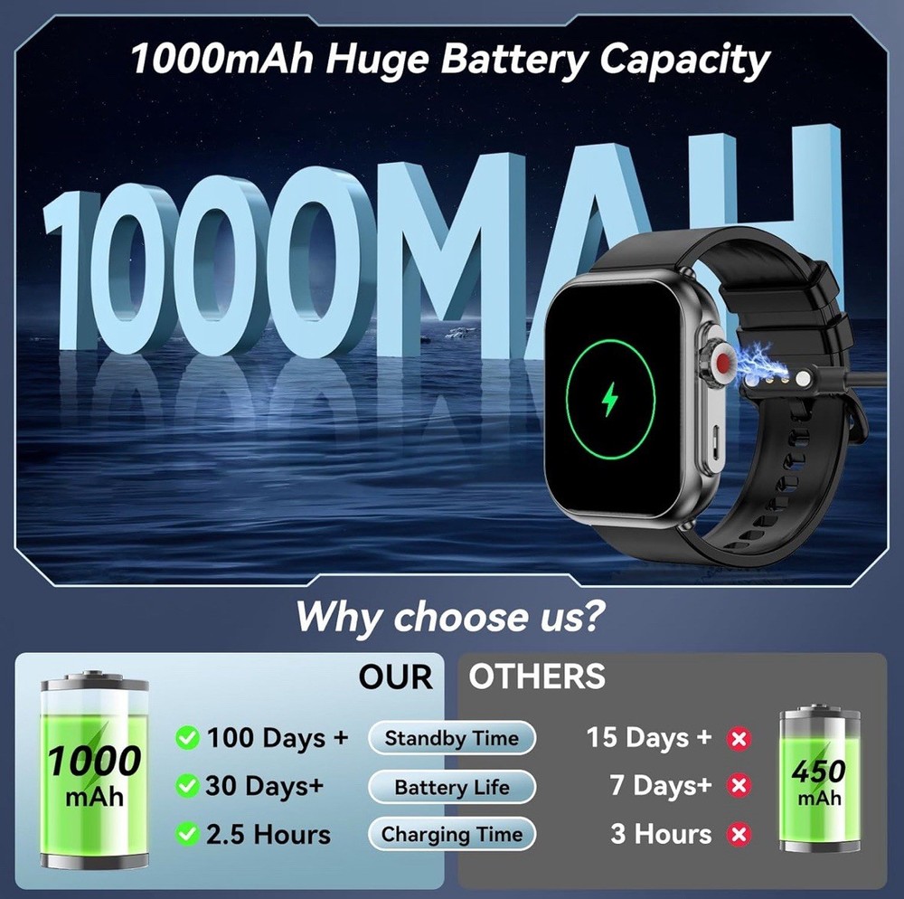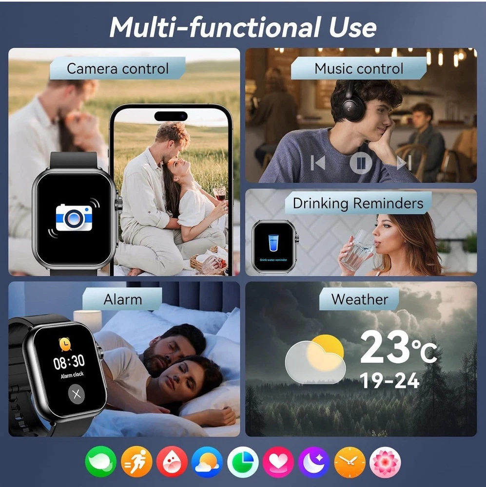 Product details Top highlights Operating System Android 4.0+, iOS 9.0+ Memory Storage Capacity 1 GB Special Feature Bluetooth Call, Message Reminder, Health Monitoring, Fitness Tracker, stopwatch, alarm clock, find your phone, sedentary reminder, music control, weather forecast, don‘t disturb mode, brightness adjustment, Camera, female cycle tracking, 1.85" HD Color Screen, Voice Call, 100+ Sports Modes, IP68 WaterproofBluetooth Call, Message Reminder, Health Monitoring, Fitness Tracker, stopwatch, alarm clock, find your phon… See more Battery Capacity 350 Amp Hours Connectivity Technology Bluetooth Wireless Communication Standard Bluetooth Bluetooth Call and Smart Notifications:Smart watches for men allows you to stay in touch with your family or friends anytime, anywhere, even when you're at the gym, outdoors, or doing other activities. You can also receive social media, Facebook, WhatsApp, and text message alerts on your wrist, so you'll never miss an important message or notification(Unable to reply to message) 1.85 Inch HD Screen and DIY Dials: Smart watch features a TFT HD color screen for superior picture quality and touch sensitivity. Men's watches have more than 100 unique online dials to choose from, and you can also customize your dial. It can be any photo, such as family, pets, etc 100 Days Standby Time and Multiple Features: Smartwatch has a built-in 1000 mAh high-capacity battery that ensures up to 20-30days of use, and about 30 days of standby time with just 3 hours of charging. The sports watch also includes weather forecast, music control, camera control, alarm, stopwatch, find phone and many other useful features. Simply download “FitCloudPro” for free from the App Store or Google Play and enjoy your smart life 110+ Fitness Modes and IP68 Waterproof: The fitness tracker watch offers up to 110+ sports modes covering running, cycling, fitness and other activities to meet different users' preferences. During exercise, it records real-time data such as heart rate, steps, calories burned, distance and activity time. This men's smartwatch is IP68 waterproof and can be worn during outdoor activities, rainy days and hand washing (Note: Please do not use it in shower, sauna, swimming, etc.Excessive temperature will affect the life of the watch) 24-Hour Healthy Activity Tracker: Smart watches for women tracks your heart rate, steps and sleep patterns around the clock. You can also track your menstruation with menstrual cycle tracking and ovulation prediction. All data is displayed in the “FitCloudPro” app, giving you a full picture of your health. The Women's Watch is compatible with Android 6.0 and above and iOS 10.0 and above(No blood pressure function)