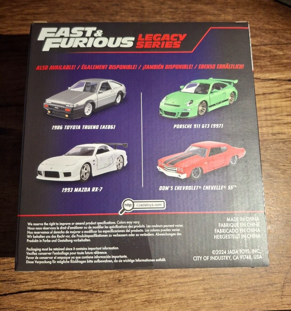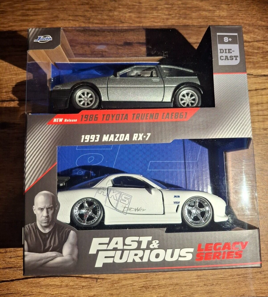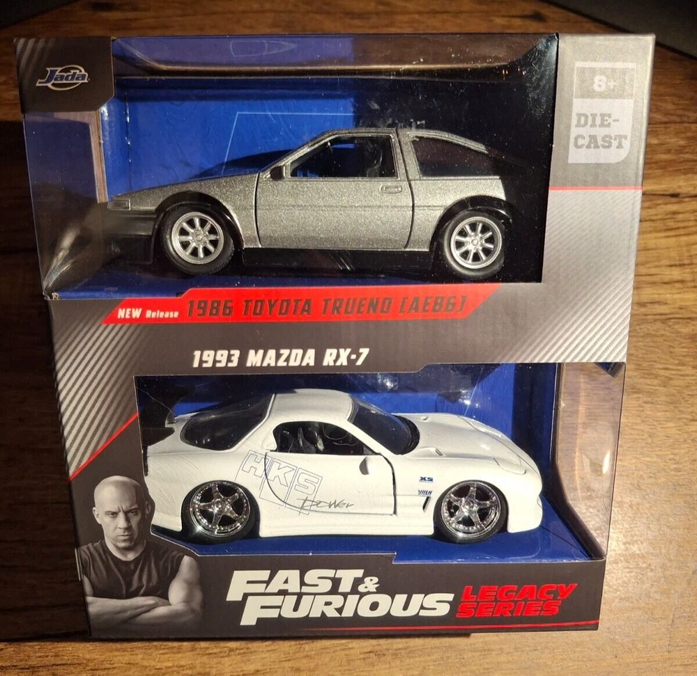 The Jada Fast & Furious Legacy Series features a 1:32 scale diecast model set including a 1986 Toyota Trueno and a 1993 Mazda RX-7 from The Fast and the Furious franchise. The set is part of the Fast & Furious series by Jada Toys, depicting iconic vehicles like the Mazda RX-7 from 1993 and the Toyota Trueno from 1986.