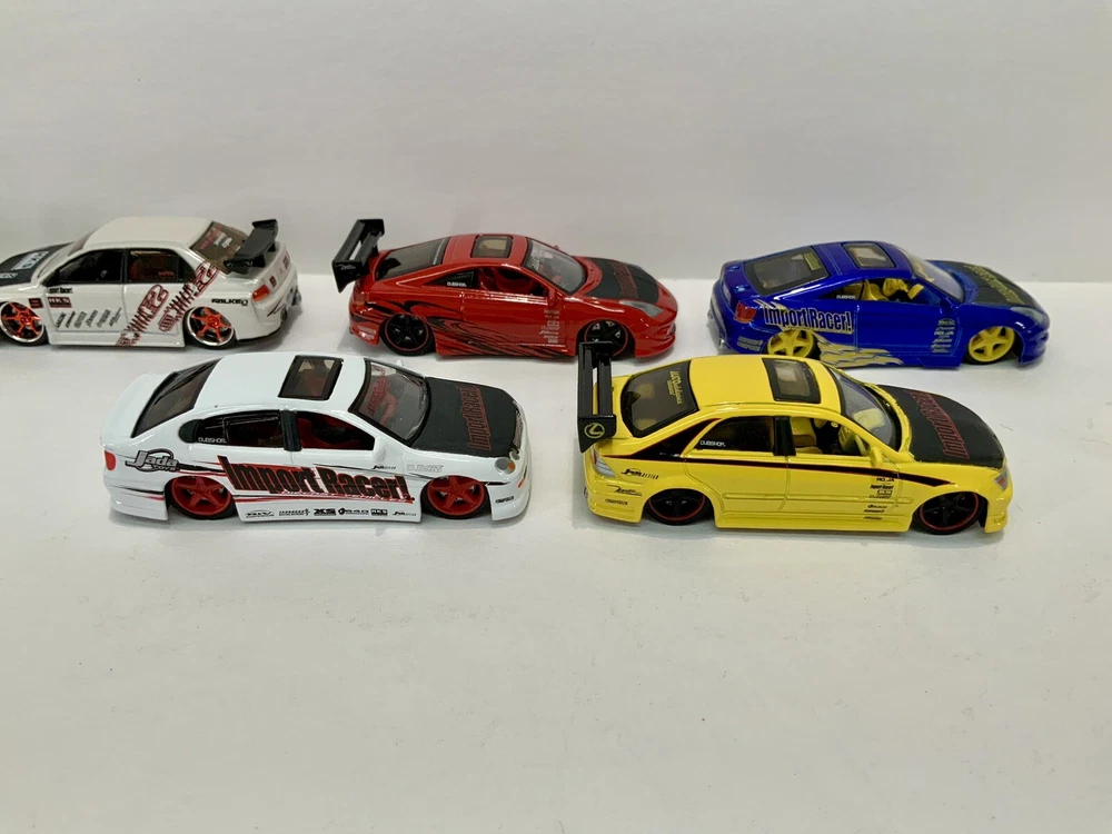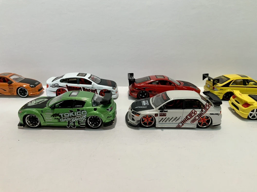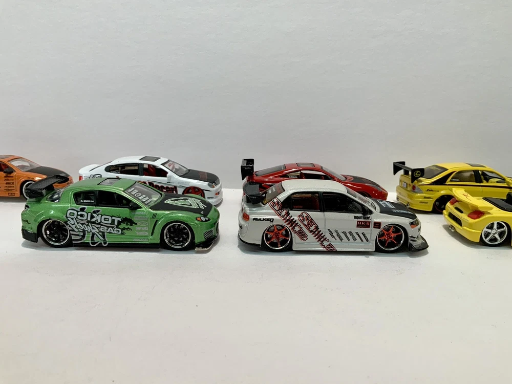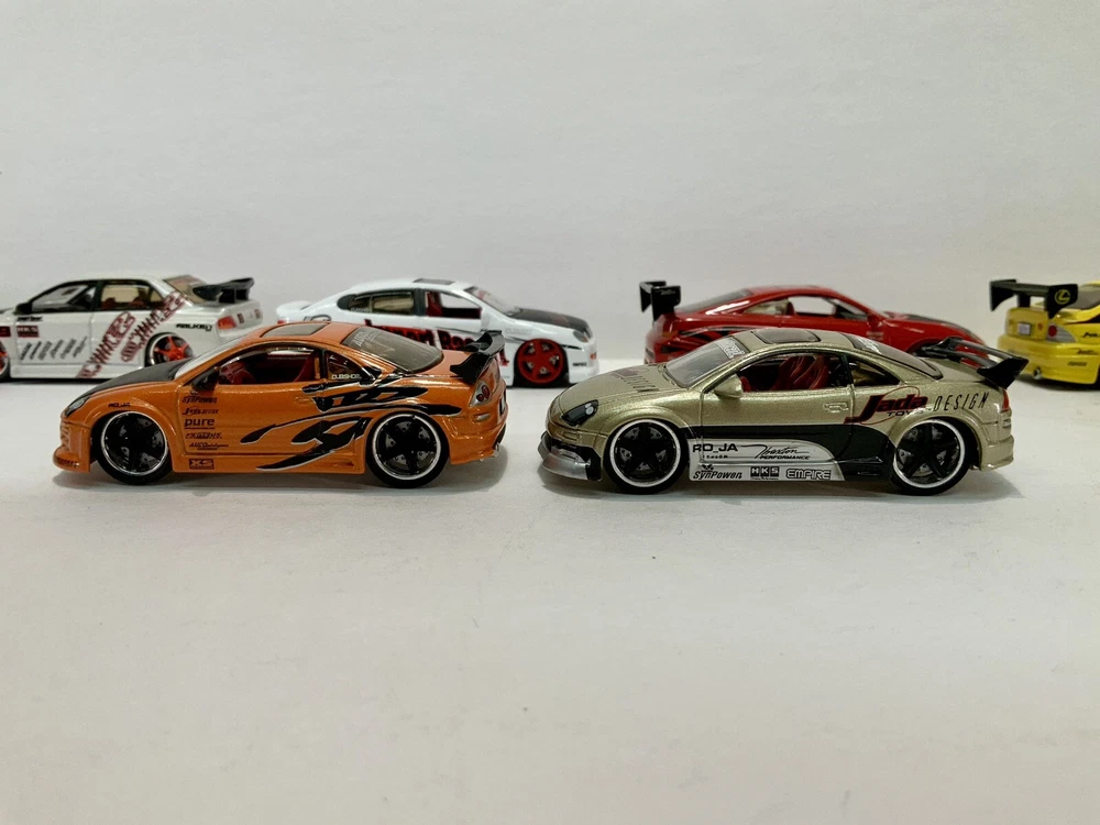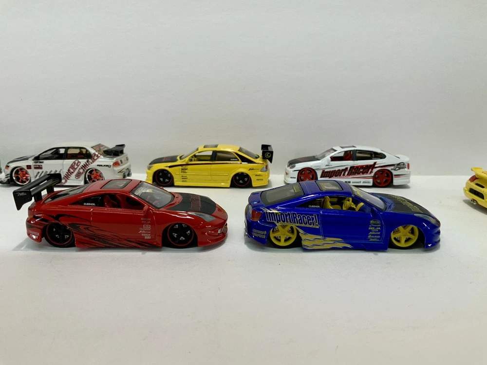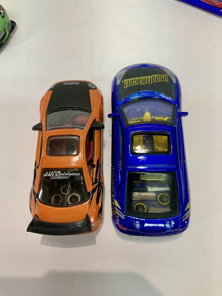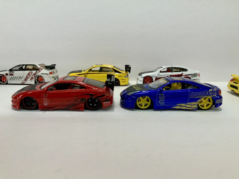 These are part of my personal collection it has been used only as a display in cabinet since it was purchased new 20+ years ago. Cars are in great condition, have never been played with, and comes from a smoke free home. Blue Toyota Celica is missing rear wing and orange eclipse has a crack in rear window. Please inspect pictures before buying. Extra care will be taken for packaging. All cars will be be bagged separately and bubble wrapped.