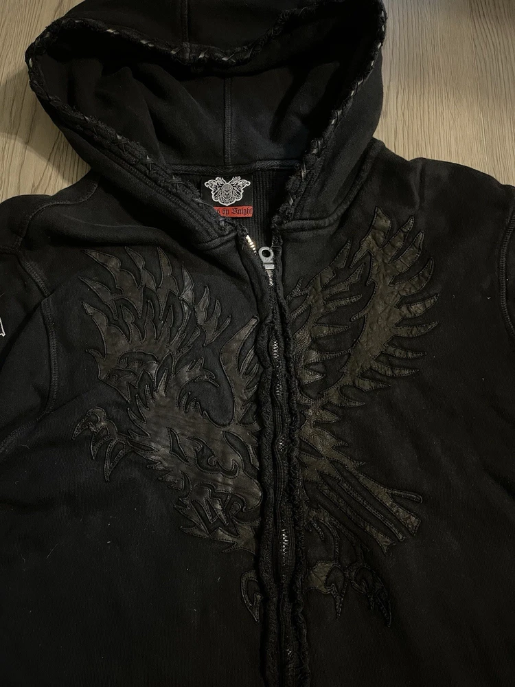 This rare, vintage hoodie is a must-have for any fashion-forward man. The black Jaded By Knight hoodie features a zip closure and is made with thermal lining for ultimate warmth and comfort. The hoodie is designed with a Y2K style and is perfect for any casual occasion. The iconic Jade character adds a touch of personality to the piece, making it a unique addition to any wardrobe. The hoodie is available in a size M and is suitable for regular size types. This item is perfect for any collector or fashion enthusiast looking to add a rare, vintage piece to their collection. Check the measurements for proper sizing, seems like a tall medium.