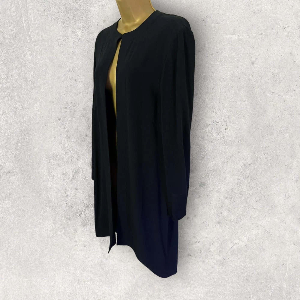 This is a beautiful longline jacket, simple in design but extremely chic. Simply stunning, elegant jacket that can be worn to the office or dressed up as a beautiful addition to any occasion outfit. Fabric: Polyester Blend Care advice: Machine washable Measurements Bust 42", 107cm Shoulder to shoulder 16.5", 42cm Sleeve length 24", 61cm Length 38", 96cm Never worn
