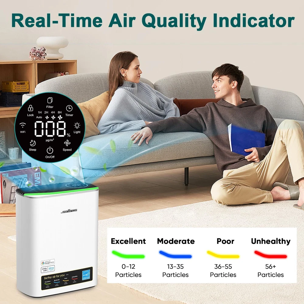 Powerful Air Purification:Air purifiers are essential for maintaining healthy indoor air quality. The Jafanda air purifier(Model: JF239), equipped with a True HEPA filter, effectively captures 99.97% of airborne particles, including dust, pollen, and pet dander. This makes it ideal for air purifiers for home and air purifiers for bedroom environments, especially air purifiers for home large room. Quiet Operation for Peaceful Sleep: Experience undisturbed sleep with the Jafanda air purifier. Its ultra-quiet operation, with a noise level as low as 20dB, makes it perfect for air purifiers for bedroom, air purifiers for dorm, office,and apartment. Enjoy the benefits of clean air without any noise disruption. Energy-Efficient Performance: Our air purifiers are designed with effective air filter with energy efficiency in mind. The Jafanda air purifier features a low-energy brushless DC motor, consuming up to 30% less energy than traditional AC motors. This not only saves you money but also reduces your carbon footprint. Aromatherapy for Enhanced Well-being: Create a relaxing atmosphere in your home with the Jafanda HEPA filter air purifiers. Enjoy the benefits of clean air while diffusing your favorite essential oils. This HEPA air purifier is perfect for those seeking a clean air & aromatherapy combo. Real-Time Air Quality Monitoring: Stay informed about your indoor air quality with the Jafanda air cleaner. Its 4-color LED air quality indicator provides real-time readings, ensuring you're always aware of the PM2.5 particle levels in your air purifiers for home large room or air purifiers for home pets.