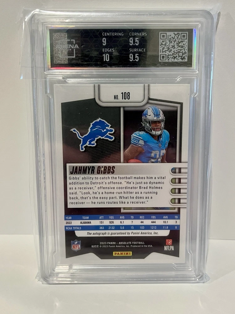 This is a Jahmyr Gibbs 2023 Absolute Purple Rookie autographed trading card graded 9.5 by Arena Club. The card features the player in his Detroit Lions uniform and is a limited edition with a serial number of #4/5. It is a rare collectible item for fans of football trading cards and specifically those interested in Jahmyr Gibbs and the Detroit Lions.
