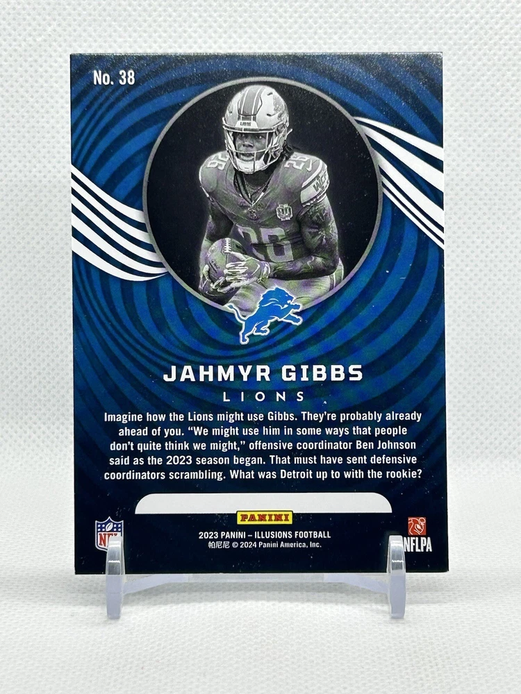This is a rare and valuable Jahmyr Gibbs Illusions 2023 No. 38 Rookie Card. It features the talented player from the Detroit Lions team, Jahmyr Gibbs, who is expected to make a big impact in the National Football League (NFL). The card is from the 2023 Panini Illusions set and has a Silver Foil parallel/variety, making it a unique collector's item. The card is not autographed, but it still has great value for any football fan or collector. It is a Sports Trading Card that showcases the player's rookie status and his potential to become a star in the NFL. This card is a must-have for any fan or collector who wants to own a piece of football history.
