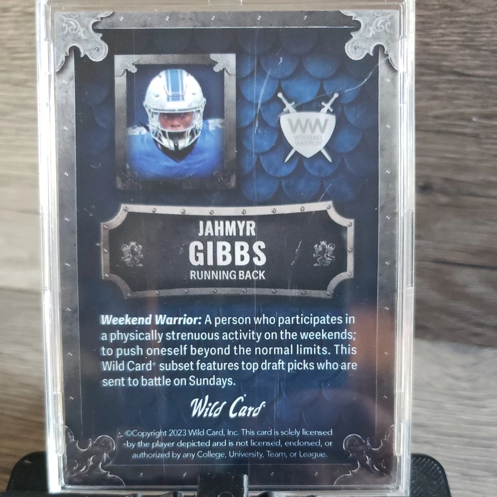 This Jahmyr Gibbs Wild Card Matte/25 sports trading card is a must-have for any football fan or sports card collector. With its sleek design and unique features, this card is sure to be a standout addition to your collection. The card is ungraded and comes from the Wild Card manufacturer, making it a rare find. As a rookie card with a serial number, this trading card is a valuable addition to any collection. It features Jahmyr Gibbs, a rising star in the football world, and is sure to impress. Don't miss out on this opportunity to own a piece of sports history.