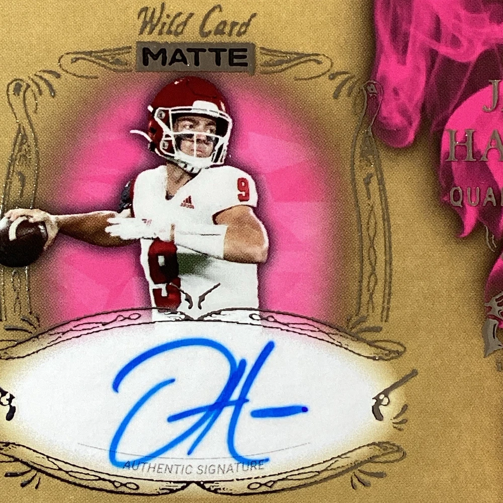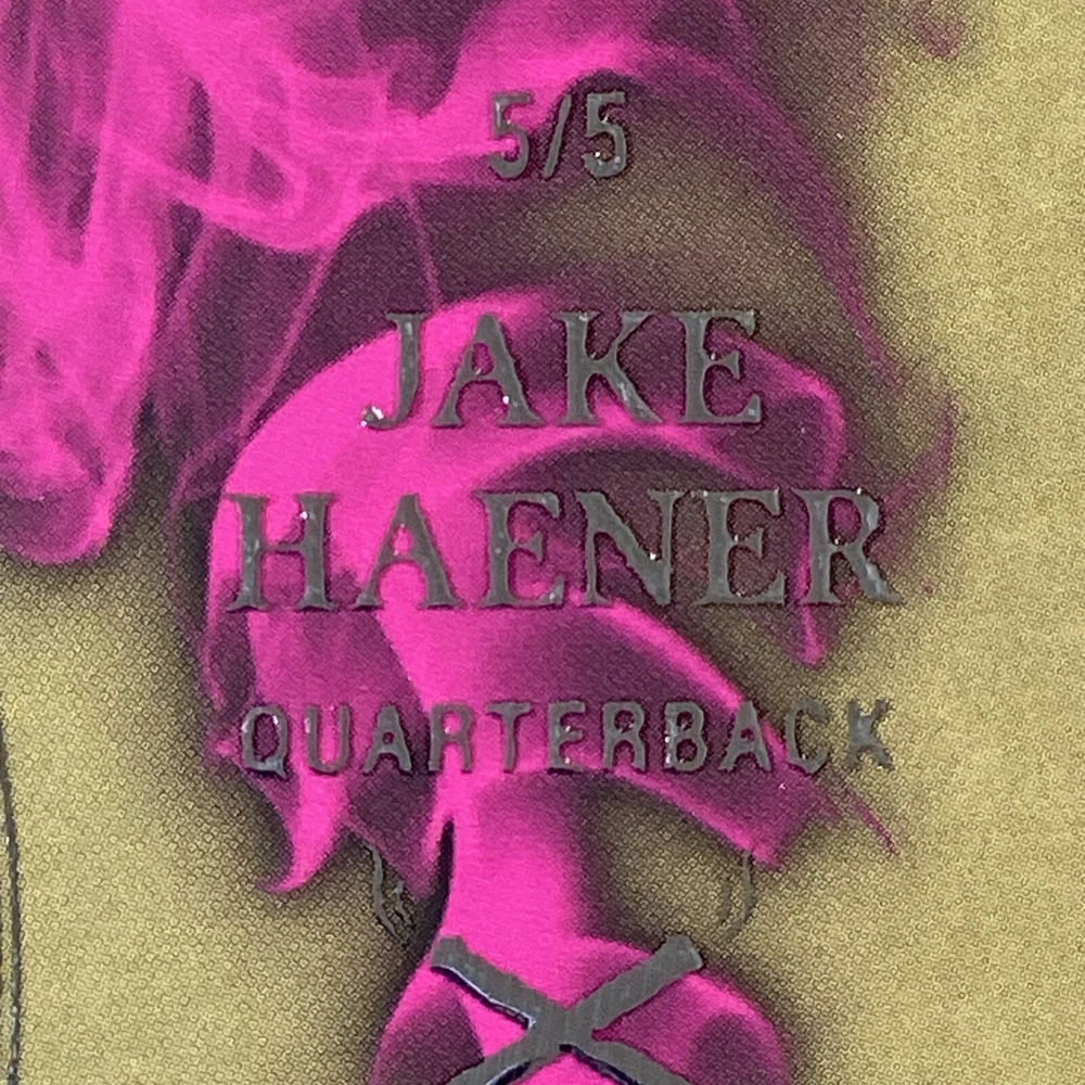 This rare Jake Haener autographed trading card is a must-have for any serious football fan. With a print run of only 5, this Smoking Guns parallel variety card is an original and licensed reprint from the 2022 Wild Card set. The card features the rookie quarterback in his New Orleans Saints and Washington Commanders uniforms and is made of high-quality paperboard, card stock, and paper. At 35 Pt. thickness, this sports trading card is a standard size and is in English language. It was manufactured in the United States by Wild Card in 2023 and is part of the National Collegiate Athletic Association (NCAA) and National Football League (NFL) leagues. Don't miss your chance to own this unique piece of football memorabilia.