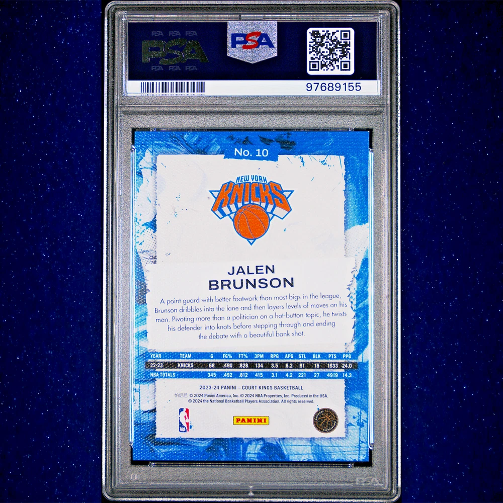 Jalen Brunson 2023 Panini Court Kings PSA 9 All orders ship within 24 hours of payment. For Graded Cards you will receive the card(s) listed in the title and pictured in the scan, because at times we may have duplicates of the exact same grade card, you will receive the exact card and grade listed but certification number might be different. Graded cards will be put in a graded sleeve, wrapped in cardboard, and shipped in bubble mailer to ensure it arrives in pristine condition. For Ungraded Single Cards you will receive the exact card(s) listed in the title and pictured. Ungraded Single cards over $20 will be shipped the same way as graded cards Ungraded Single cards under $20 will be shipped in a toploader and team bag using eBay standard envelope, if you would prefer to have it shipped with more protection in bubble mailer, please send us a message and we can provide an updated shipping quote for you. RETURN POLICY : We allow returns with full refunds but do not offer partial refunds. Returns are available to our customers if they did not get the item they are intended to receive. They are not for them to buy and decide they do not want them. 1. Items returned because of damage, missing parts, wrong item sent, will be given full refunds 2. Items returned because of buyers remorse, changed my mind, found better price, just didn't like it will by charged a minimum of 20% restocking fee SALES TAX : Sales tax is charged in accordance w/all of eBay's policies and the state where the item is being sent. ADDITIONAL INFORMATION : We are actively accepting ebay consignments, please message us for any inquiries. THANKS FOR LOOKING AND PLEASE MESSAGE US WITH ANY QUESTIONS! Check out our other eBay listings by clicking this link: TopShop828 eBay Store !