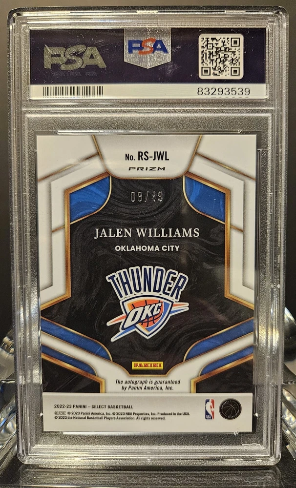 Jalen Williams RC Auto PSA 10/10 == #Match (#8/49) & Color-Blue ROOKIE Gem Mint VERY RARE SSP. The ultimate J-Will card: 1) Is a rookie card. 2) Is an autograph card. 3). A PSA10/10 Gem "Double Dime" 4). Is a color match (Being a BLUE variant and that matching the OKC Thunder). 5). Is the jersey # Match of the set.