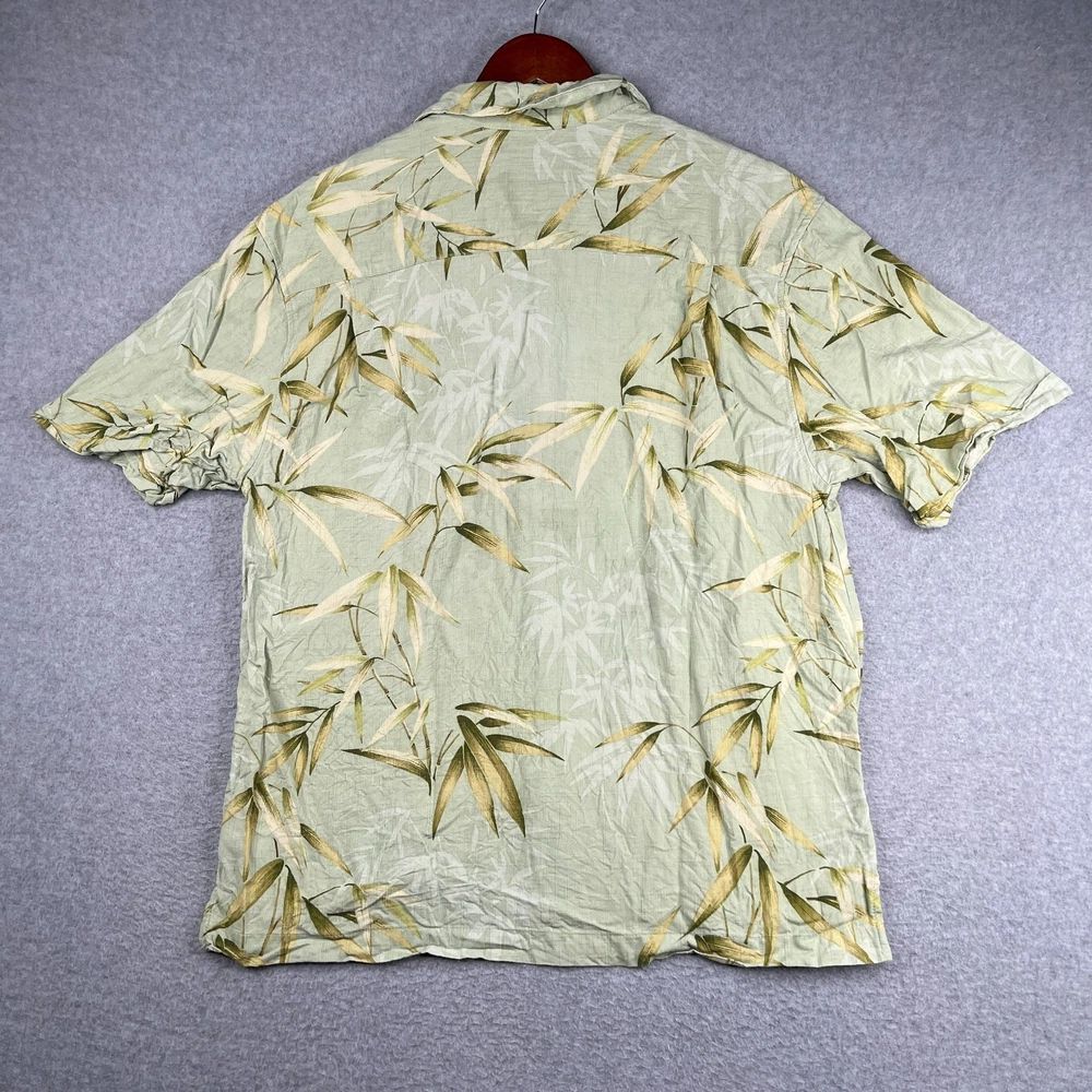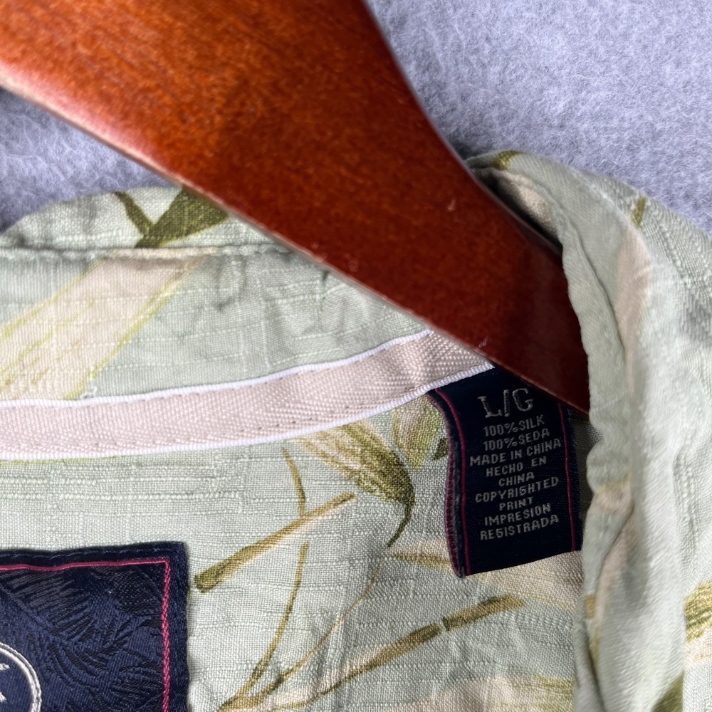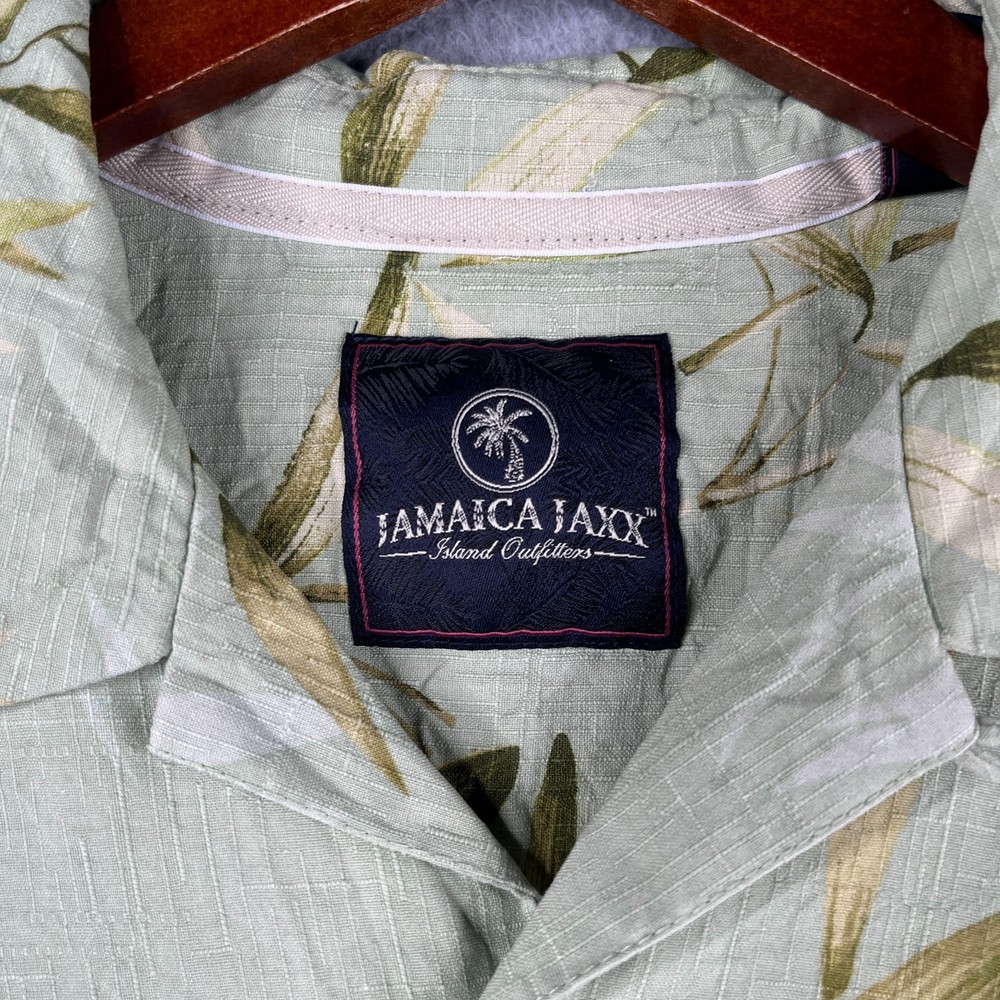 The Jamaica Jaxx Silk Hawaiian Print Shirt in size Large is a stylish and casual button-up shirt perfect for any occasion. Made from luxurious silk fabric, this short sleeve shirt features a beautiful floral Hawaiian print in a vibrant green color. The collared neckline and spread collar style add a touch of sophistication, while the accents of buttons and pockets complete the classic look. Machine washable and suitable for the summer, fall, and spring seasons, this shirt is a must-have for any man's wardrobe.