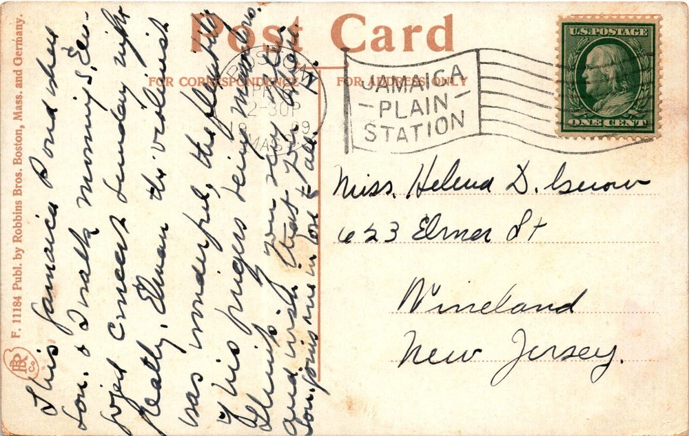 Jamaica Pond, Jamaica Plain, Mass, Robbins Bros, Boston, Germany, Postcard