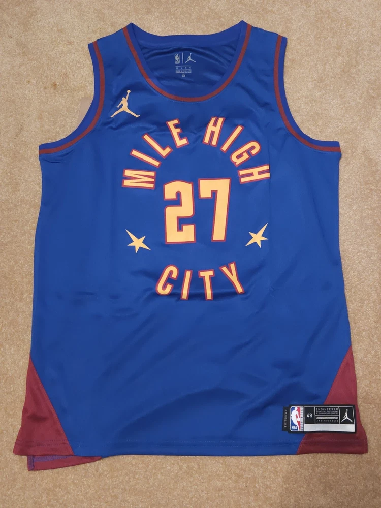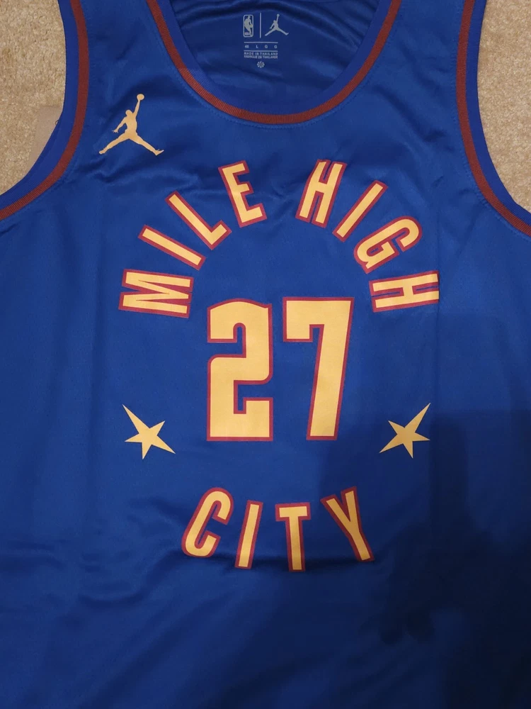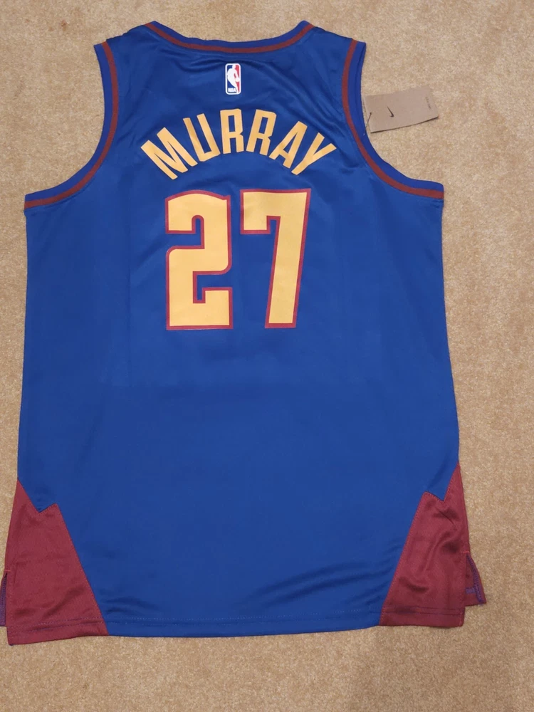 Show your support for the Denver Nuggets with this replica Jamal Murray Mile High City Connect jersey. Made for men, this size 48 blue jersey features Jokic's name and number, perfect for showing off your love for the National Basketball Association (NBA) and one of its top players. Whether you're wearing it to a game or just out and about, this jersey is sure to turn heads and make a statement. Represent your favorite team and player with this replica jersey, great for basketball fans and collectors alike. Perfect for regular season games or adding to your fan apparel and souvenirs collection. Don't miss your chance to own a piece of NBA history.