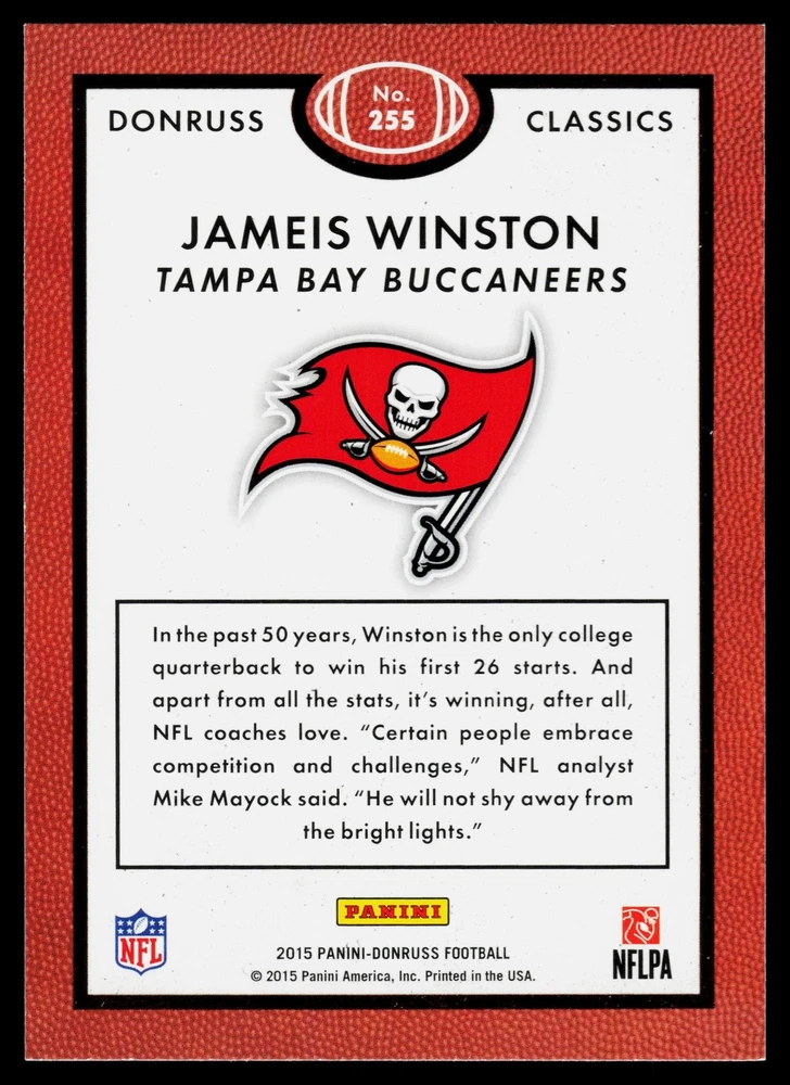 You will receive a Excellent, Jameis Winston, 2015 Donruss, Red Foil, 255 Tampa Bay Buccaneers card PLEASE NOTE: SOME CARDS THAT GO THROUGH OUR SCANNER MAY APPEAR TO HAVE LINES THROUGH THEM. THEY ARE NOT ACTUAL SCRATCHES, SIMPLY FALSE IMAGE LINES. WE WILL NOT INTENTIALLY SELL, DAMAGED CARDS. NEW CARDS LISTED DAILY ORDERS SHIP NEXT DA Y (Weekends as mail service is available) VISIT OUR STORE FOR MORE DEALS! USE THE SEARCH ICON IN THE STORE TO FIND YOUR FAVORITE TEAMS & PLAYERS! Be sure to save us as sellers to be the first to be notified when new and exciting cards are posted! Please note, we are not professional graders, and the condition of the card you purchased is highly subjective. Please refer to the high quality scans of the card you are viewing, and determine the condition of the card for yourself. Feel free to reach out with questions! All cards are in EX-NM+ condition, unless stated otherwise Chrome cards from various brands might have minor light surface scratches, which is typical with these type of cards. Any major, deep scratches or major surface issues will be noted, if present. We take pride in the condition of all of our cards, including commons. Our promise to you, is that we will not sell a card we would not buy ourselves. Of course things slip by, however customer service is our #1 Priority, and we are always here for a message for ANY, and ALL issues. Thank you very much for stopping by, feel free to reach out! - Titan (Son) & Andy (Dad)