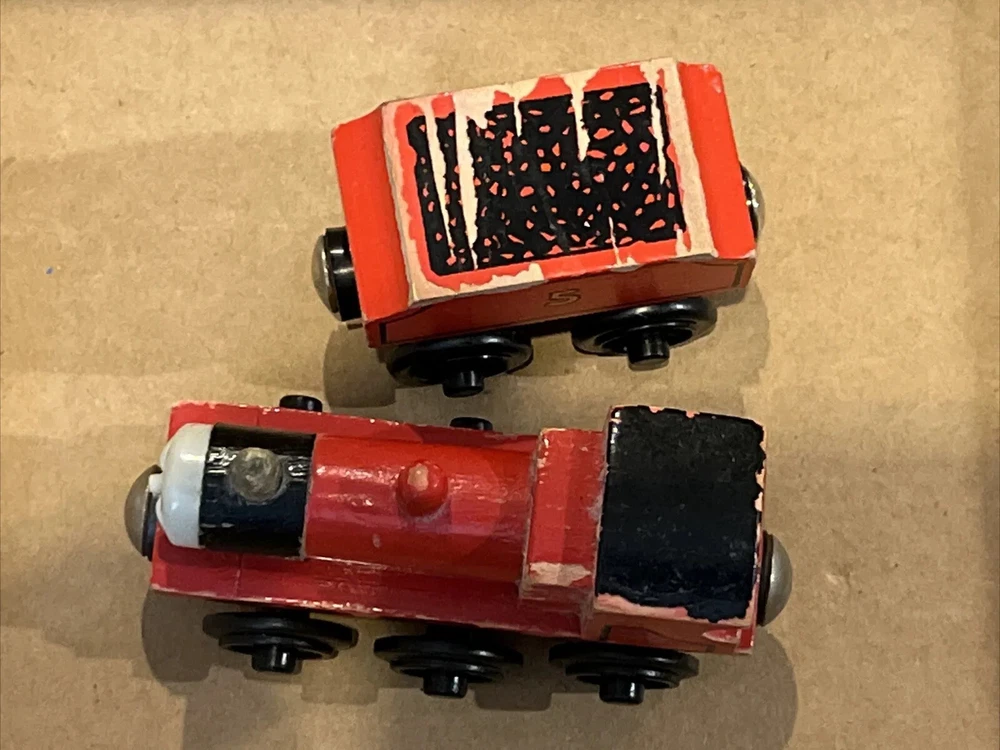 Thomas & Friends Wooden Railway Train Tank Engine - 1998 James and mismatched tender. See photos for wear and tear. Plenty to go around. Shipped USPS first class package.