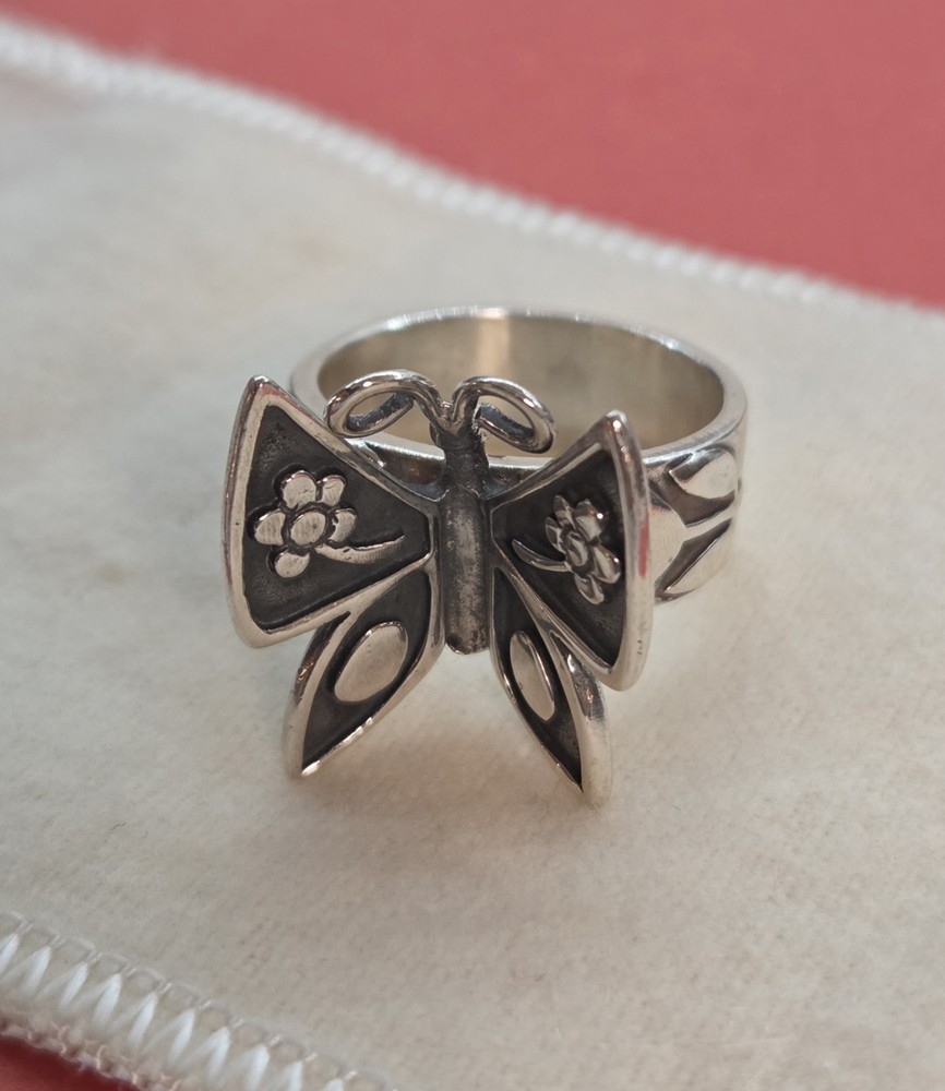 The James Avery 925 Sterling Silver Mariposa Butterfly Ring is a beautiful and unique piece of fine jewelry. Crafted with 925 sterling silver, this ring features a charming butterfly shape with a band width of 17.8mm. It is signed by James Avery, ensuring its authenticity and quality. The 3D style and artistic design will be a standout piece for anyone with an eye for something unique.