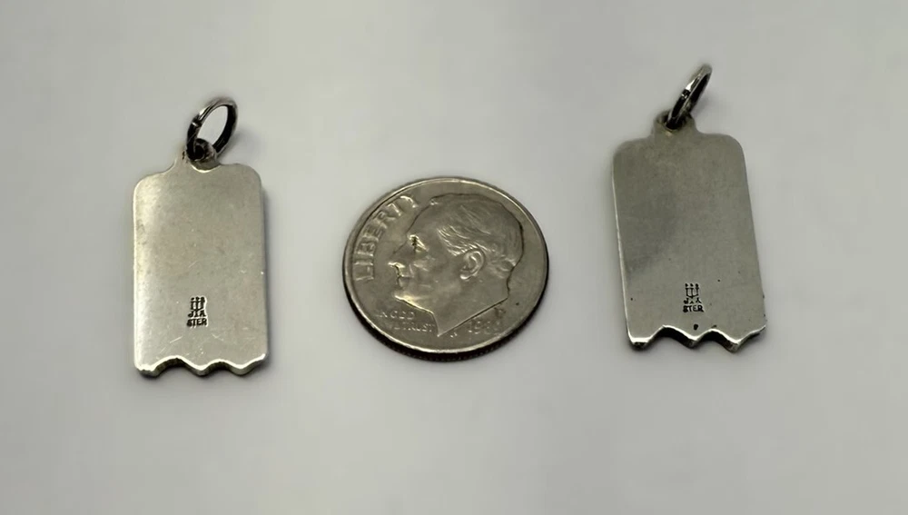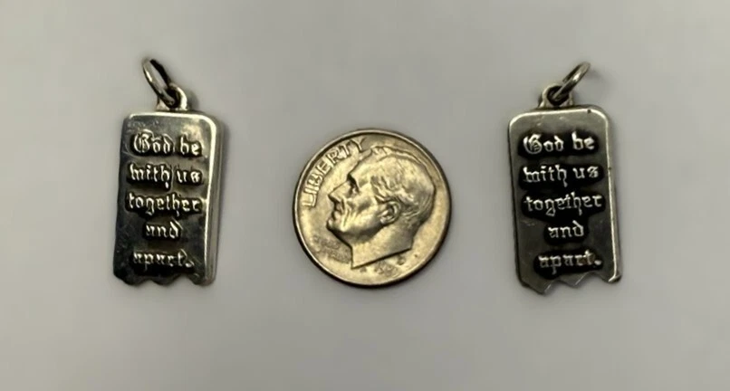 James Avery Sterling Silver Mizpah Scroll Charms (Two Charms) Scroll Reads "God be with us together and apart" The Two Charms fit Together like a Puzzle Marked J A and Sterling Retired 3/4" x 1/2" 3.45g Each Charm 6.9g Combined