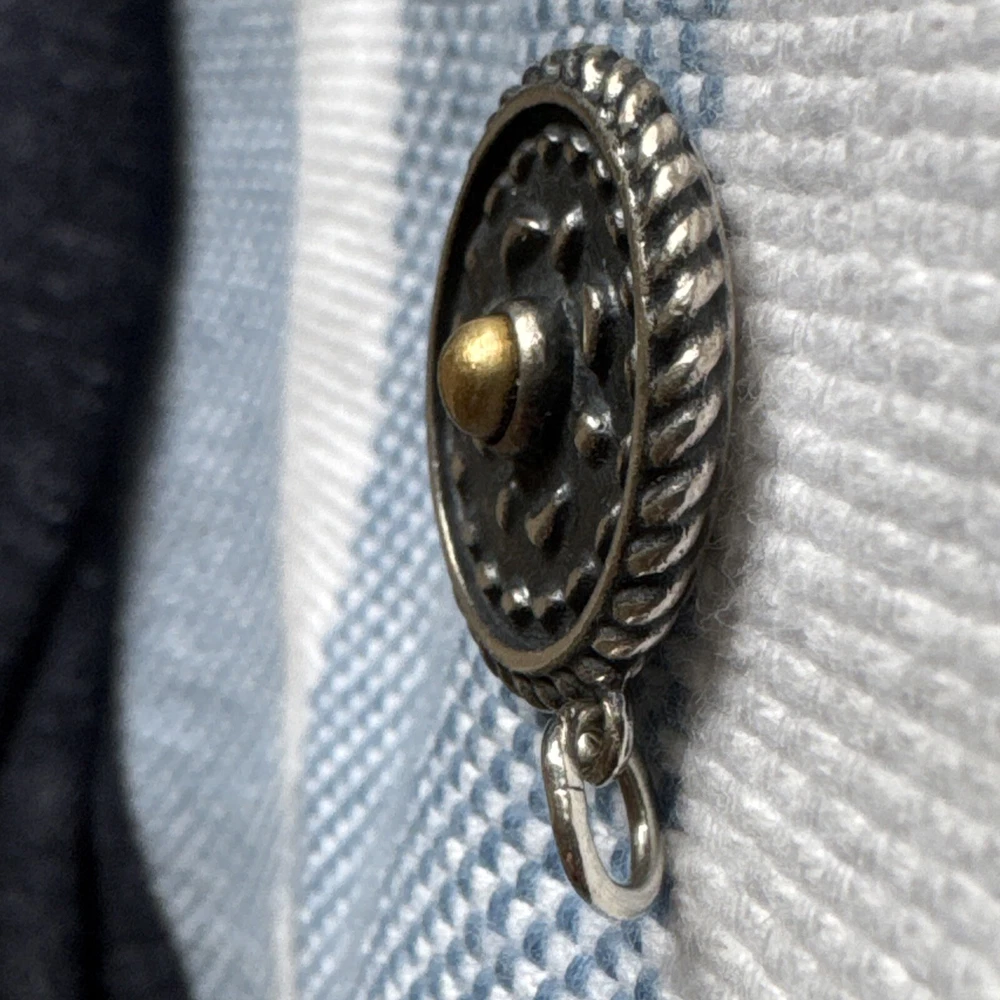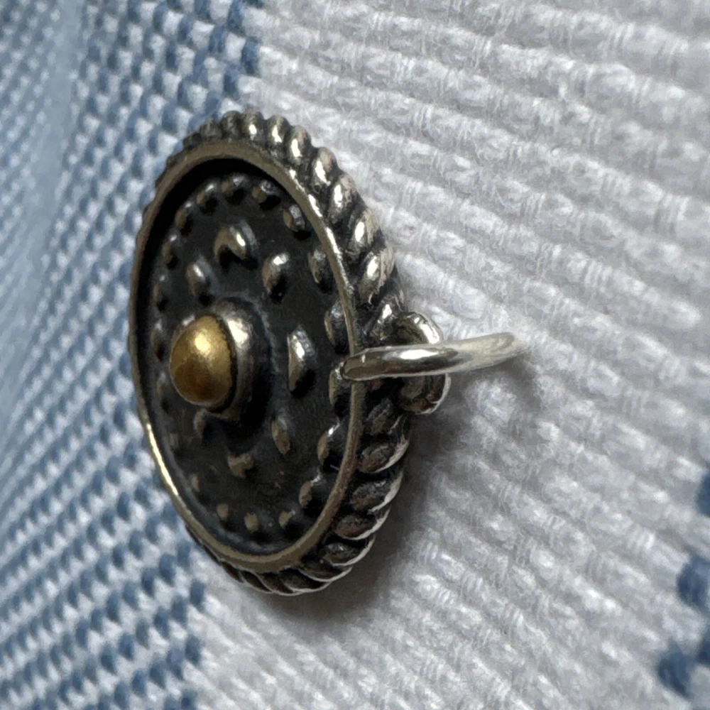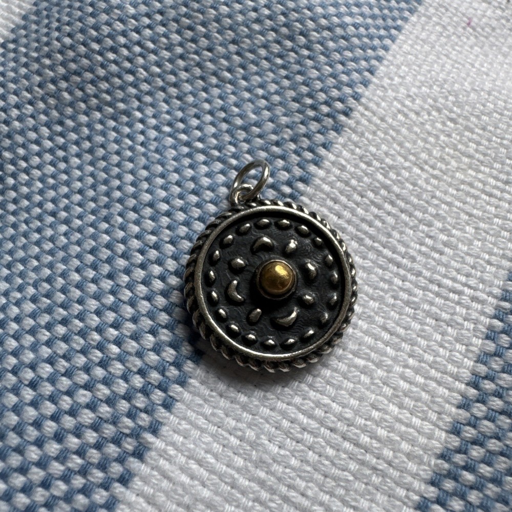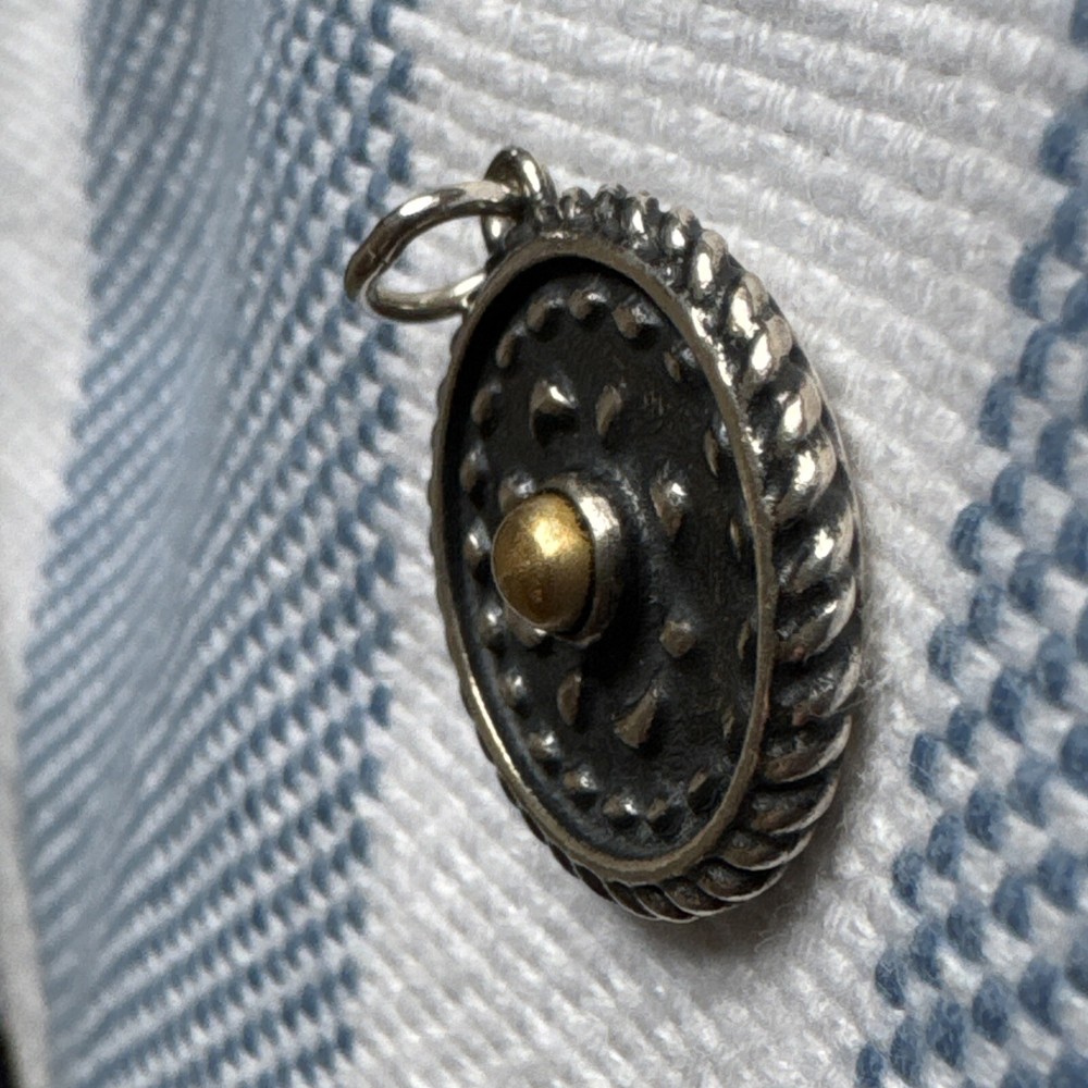 This James Avery charm is a retired and hard-to-find piece that features a combination of silver and bronze elements, adding a unique touch to its heirloom design. The charm is crafted from 925 silver with a bronze accent, giving it a vintage and sophisticated look. As a charm, it can be added to a bracelet or necklace to customize and personalize your jewelry collection with a touch of elegance and rarity from this esteemed brand.