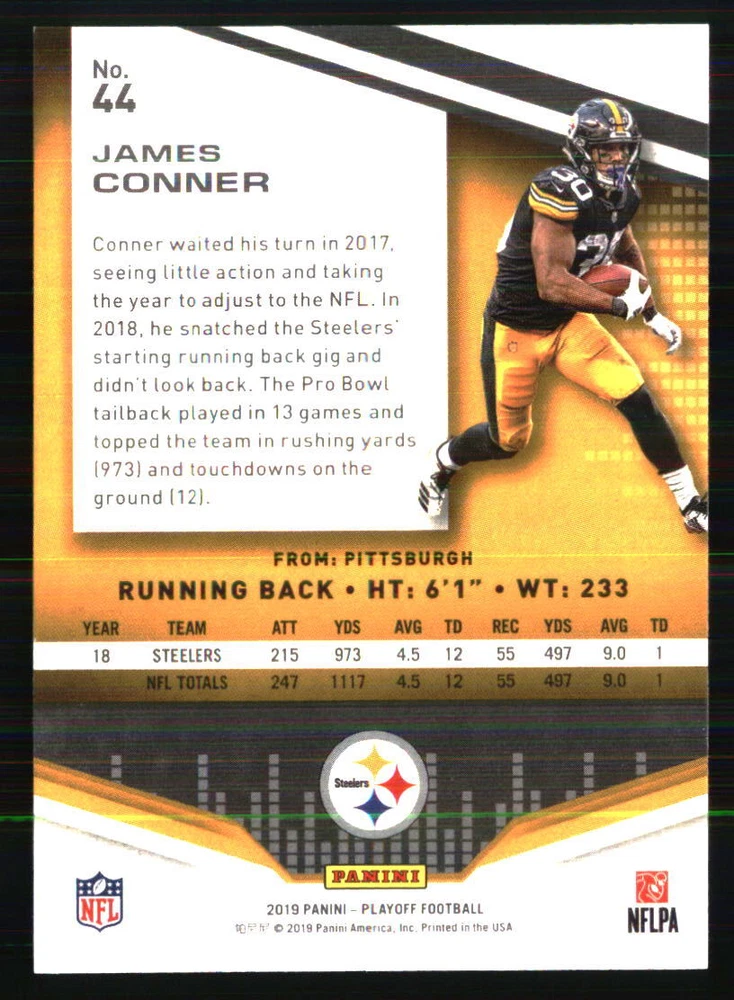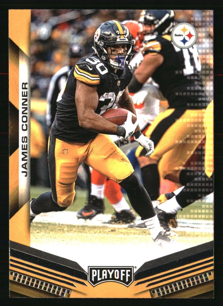 Sport: FOOTBALL Season: 2019 Card Number: 44 Type: Sports Trading Card Autographed: No Graded: No Player|Athlete: James Conner Manufacturer: Panini Set: 2019 Panini Playoff League: NFL Year Manufactured: 2019 Team: Pittsburgh Steelers