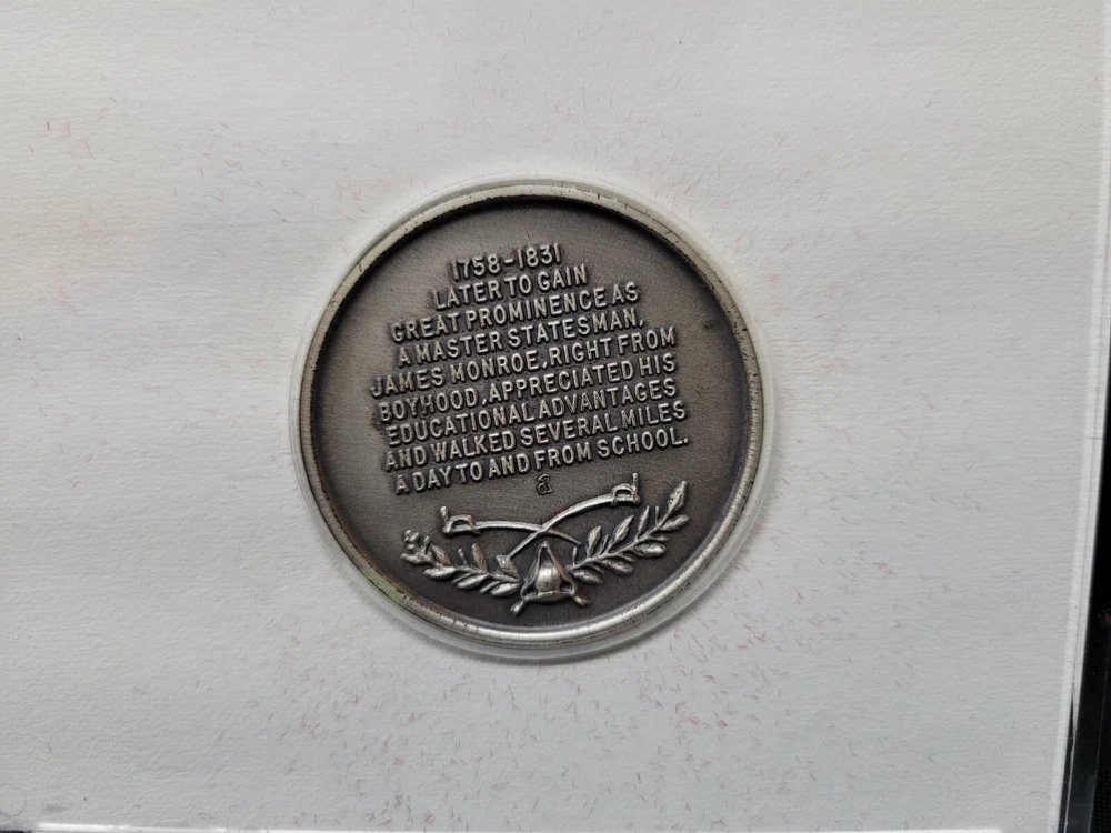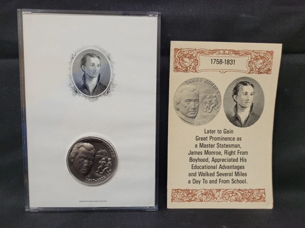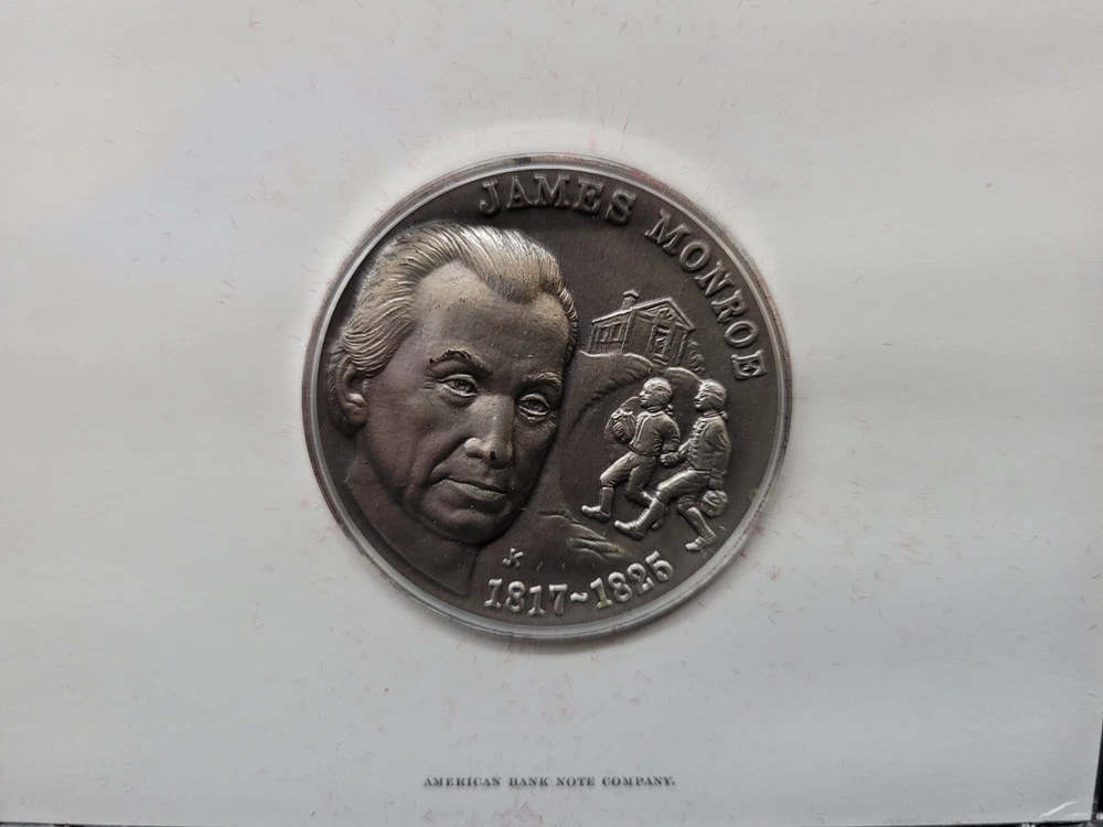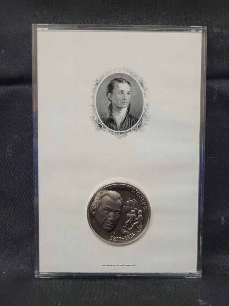 James Monroe Sterling Silver Wittnauer Art Medal In American Bank Note Display With Information Pamplet 34.9 Grams Like New Exact Coin and Display Pictured Track Page Views With Auctiva's Counter