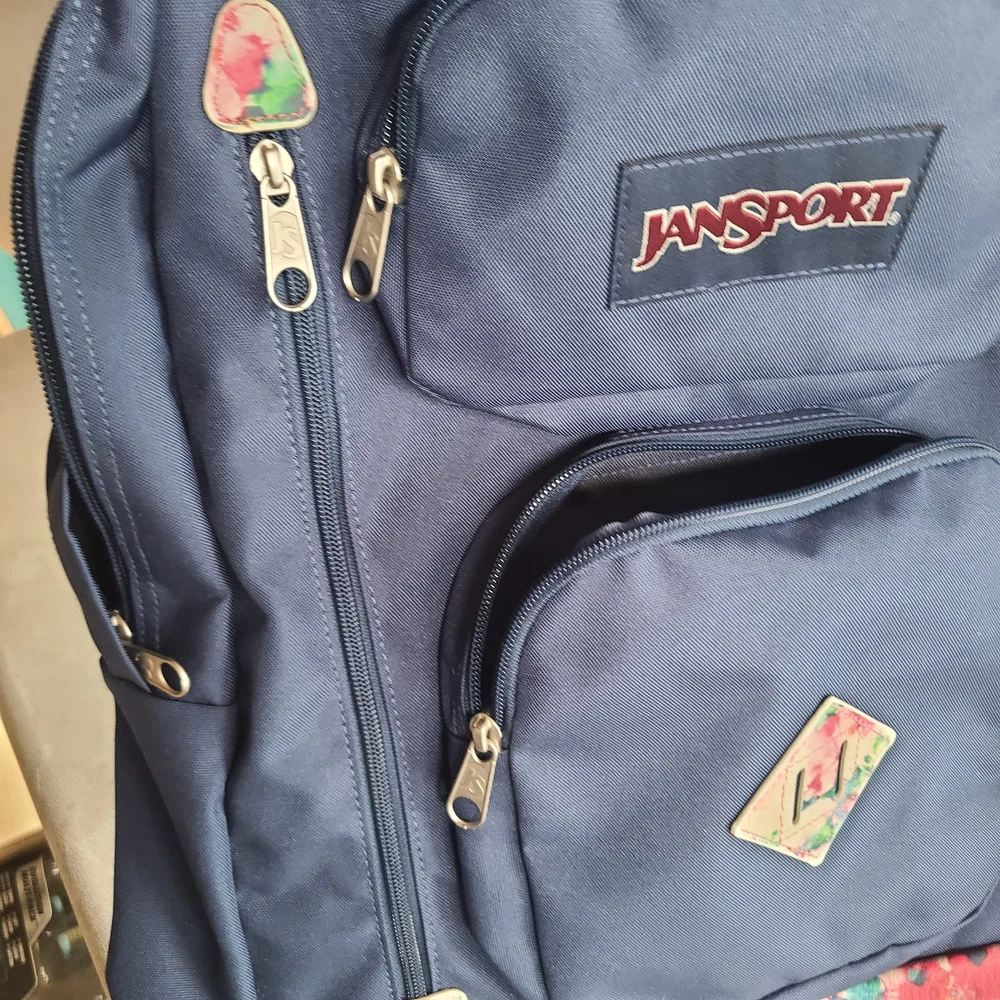 GREAT CONDITION JanSport AUSTIN backpack in Stella Blue with a floral pattern on the bottom. It is a large size backpack made of canvas with faux leather accents on the strap and zipper. The bag features inner and outer pockets, a laptop sleeve, adjustable straps, and the JanSport T71A model. The design is centered around a flower theme, making it a stylish choice for girls. With few flaws