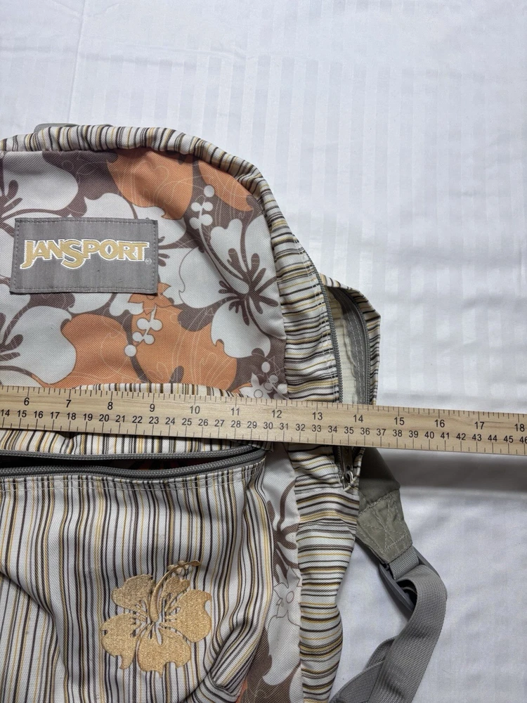 Pattern: Floral Bag Height: 17.5" Bag Width: 13" Theme: Colorful Style: Backpack Product Line: JanSport Model: cross town Color: Multicolor Handle/Strap Material: Polyester Bag Depth: 10" Closure: Zip Department: Unisex Adults Brand: JanSport Features: Adjustable Strap, Bottle Pocket, Certificate of Authenticity, Eco Friendly, Key Clip, Lightweight, Padded, Pockets, Water Resistant Exterior Material: Polyester Occasion: Business, Casual, Travel Material: Polyester Size: Large Lining Material: polyester