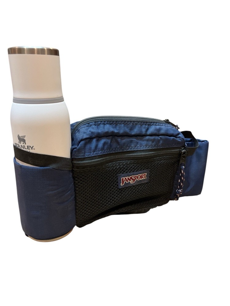 You are buying a pre-owned JanSport USA Made Blue Hiking Fanny Waist Pack Bag 2 Bottle Holsters Vintage. This bag has normal wear, no major stains, holes or tears, working zippers and closures, plenty of life left. (Water Bottle Pictured NOT Included) Measurements: Height: 8" Width: 15" Depth: 4" Ships Free with USPS Ground Advantage. Free Returns. Will Ship Within 24 Hours of Payment.