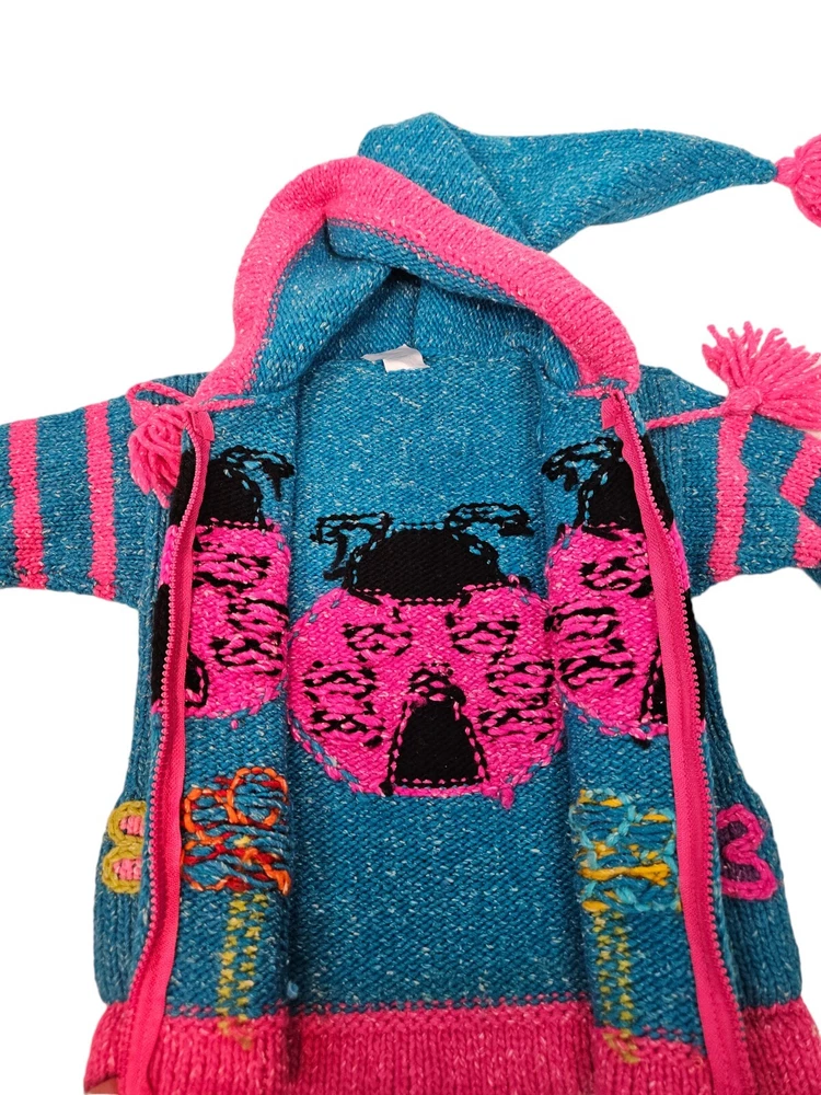 Janett'es Designs Handmade Wool Blend Full Zip Hooded Sweater Girls Small H50 In excellent condition Janett'es Designs Handmade Wool Blend Full Zip Hooded Sweater Girls Small. Features adorable colorful handmade wool blend ladybug sweater, full front zipper, hood with elf like extension and hot pink pom pom, hot pink ladybug knitted on front and back, drawstring hood with hot pink pom poms, charming floral design at bottom hem, long sleeve with stripes, unique shacket for your little girl. size small 6/8 Please review measurements as this is a handmade wool sweater and there is no size tag. Measurements laying flat chest 12.5" length 16" arm inseam 12.5" Fabric wool and cotton This is a pre-owned item that may show signs of wear. In excellent condition, no flaws.