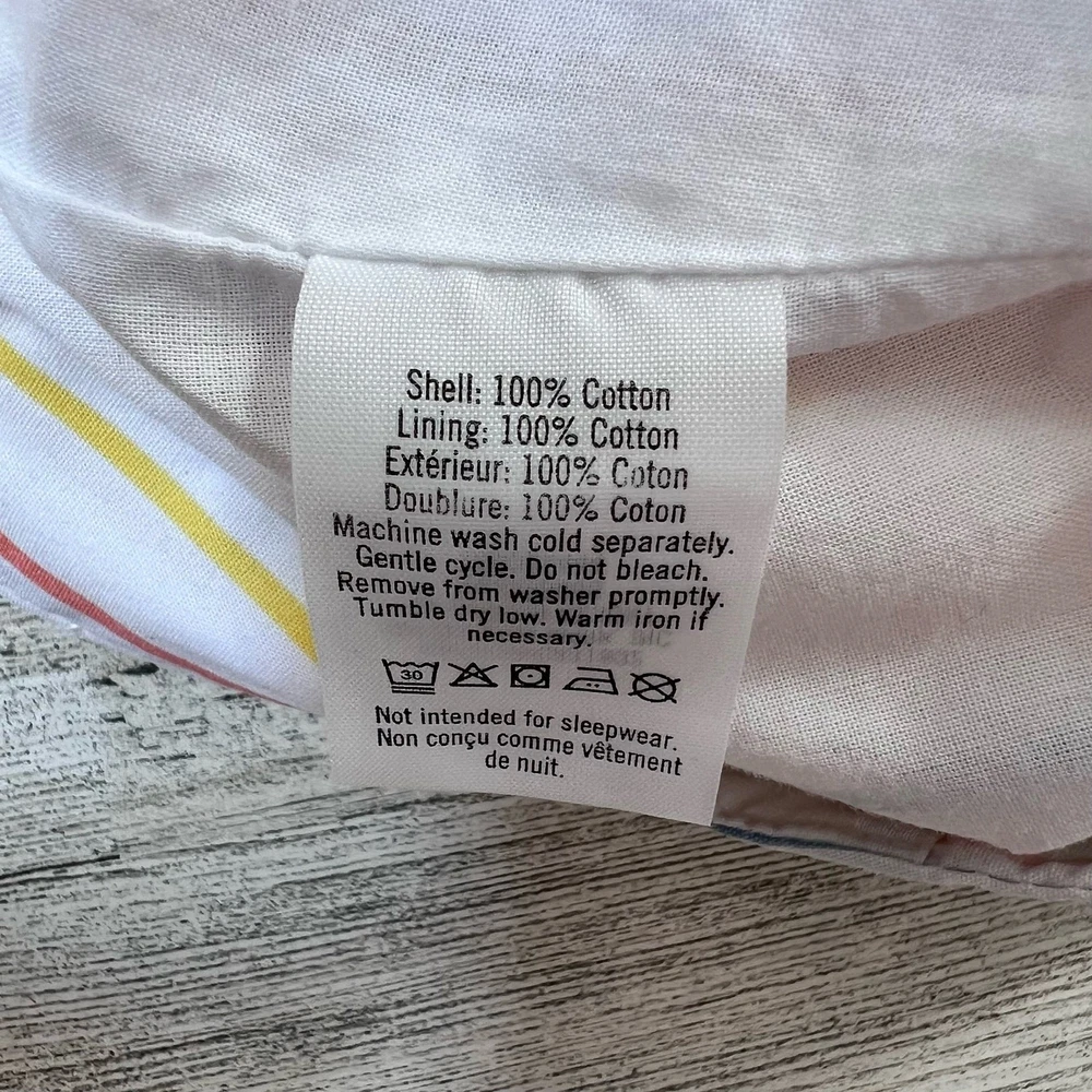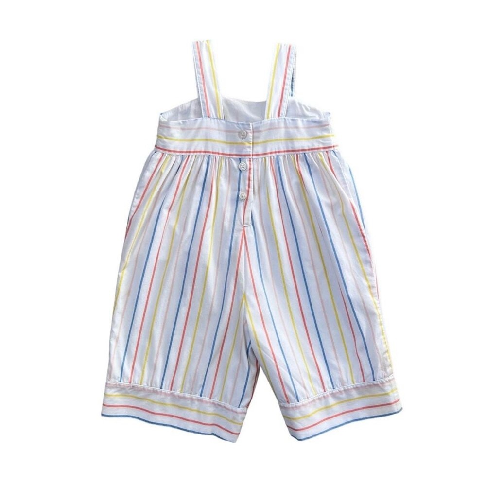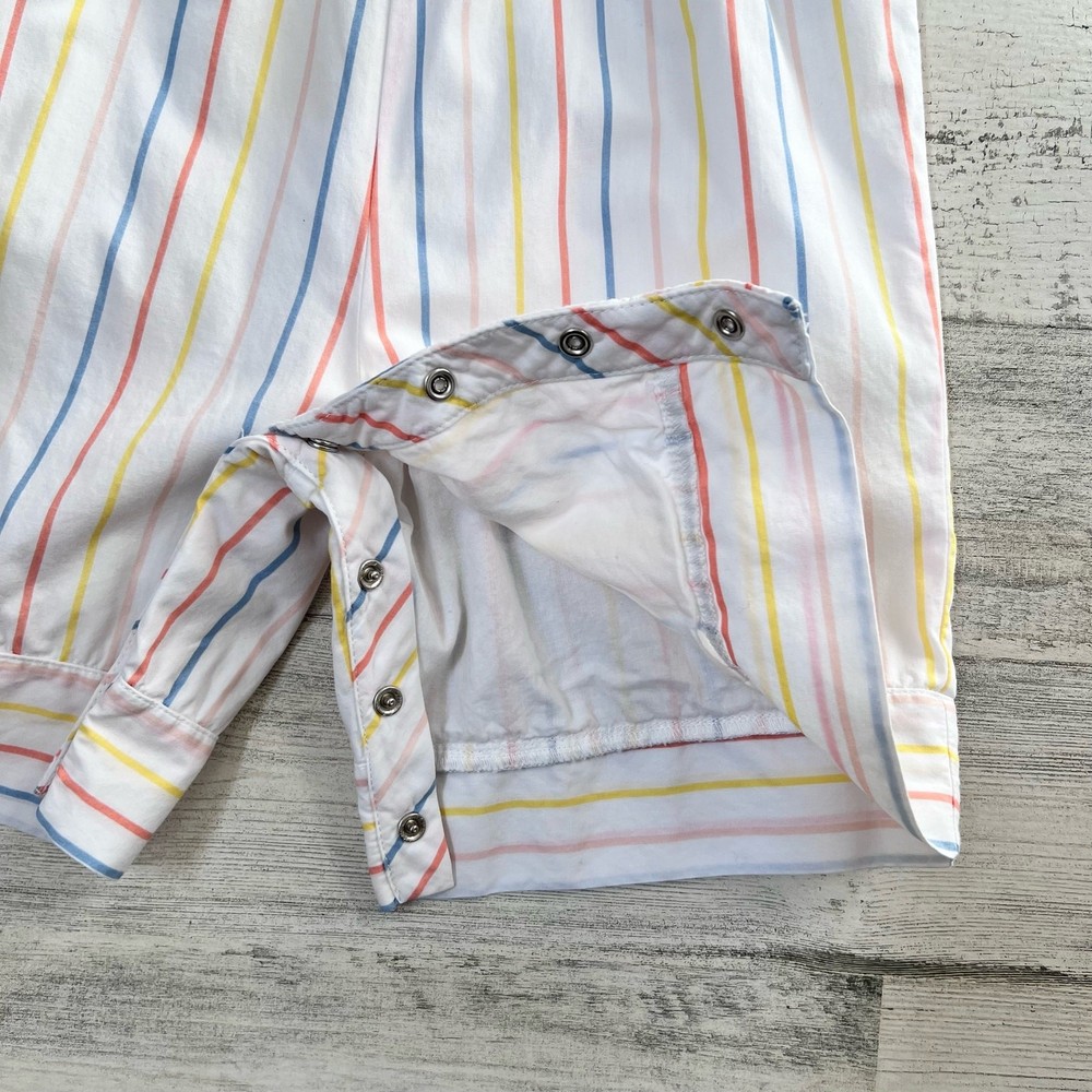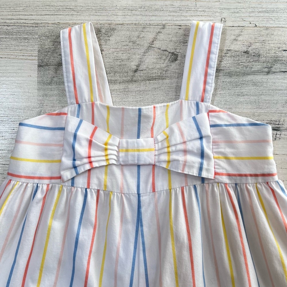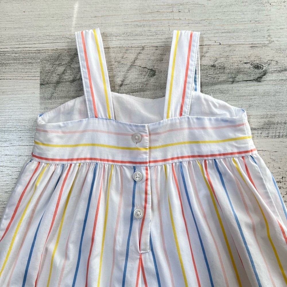Adorable Janie and Jack baby jumpsuit in soft woven cotton with rainbow stripes. Features a structured waistband with a sweet bow, button back closure, snap legs for easy diaper changes, and wide straps. Fully lined for comfort and style — perfect for warm weather occasions. • Brand: Janie and Jack • Size: 6-12 months • Color: White base with multicolor rainbow stripes • Material: 100% cotton shell, 100% cotton lining • Style: Sleeveless baby jumpsuit / playsuit one piece • Features: Snap legs, back button closure, bow detail at waist, wide straps, fully lined • Condition: Very good used condition — no flaws noted • Style aesthetics: classic, preppy, colorful Ships fast from a clean, smoke-free, pet-friendly home. Bundle to save!