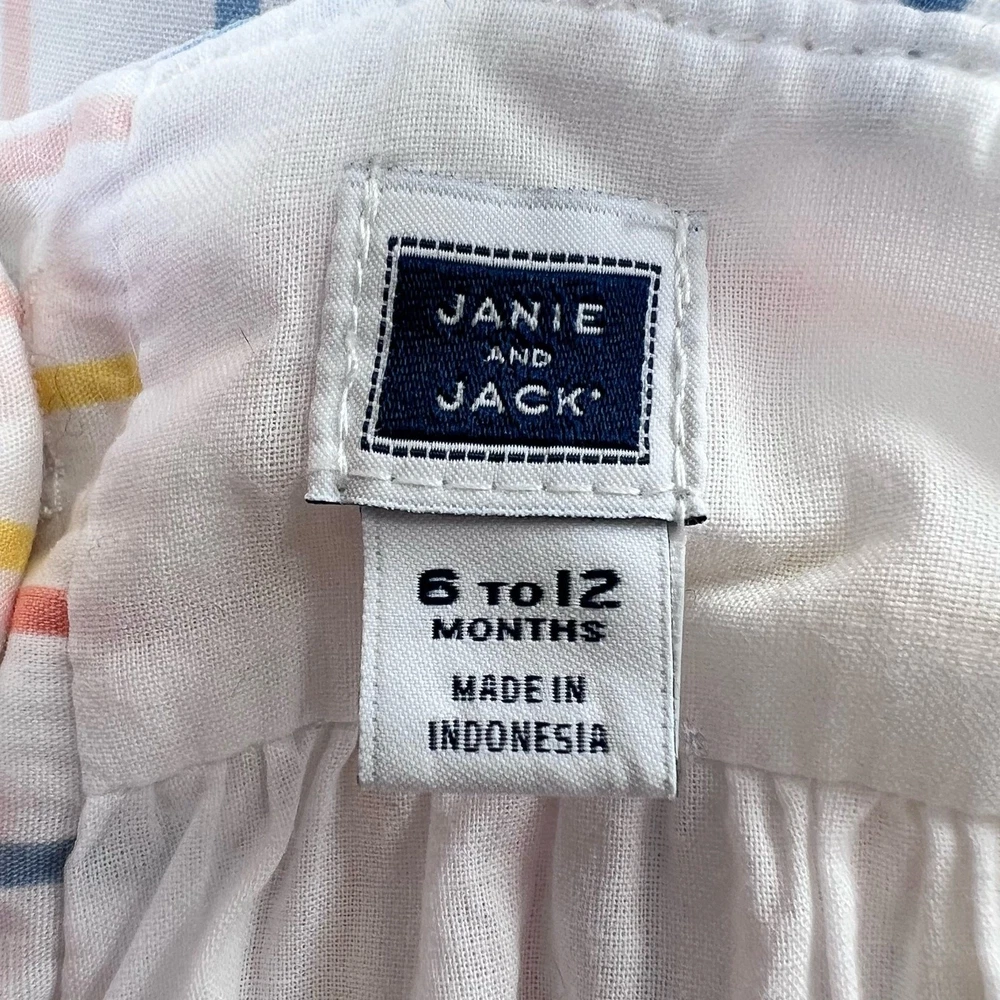 Accents: Bow Brand: Janie and Jack Neckline: Square Neck Season: Spring, Summer Material: 100% Cotton Country/Region of Manufacture: Indonesia Type: One-Piece Occasion: Casual, Party Sleeve Length: Sleeveless Handmade: No Pattern: Striped Vintage: No Department: Girls Closure: Snap Personalize: No Garment Care: Machine Washable Style: Jumpsuit Color: White Size: 6-12 Months Fabric Type: Woven Theme: Classic, Colorful, Rainbow Features: Breathable, Easy Care, Lined Number of Pieces: 1 Piece