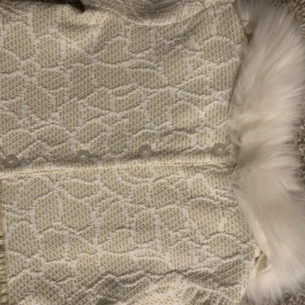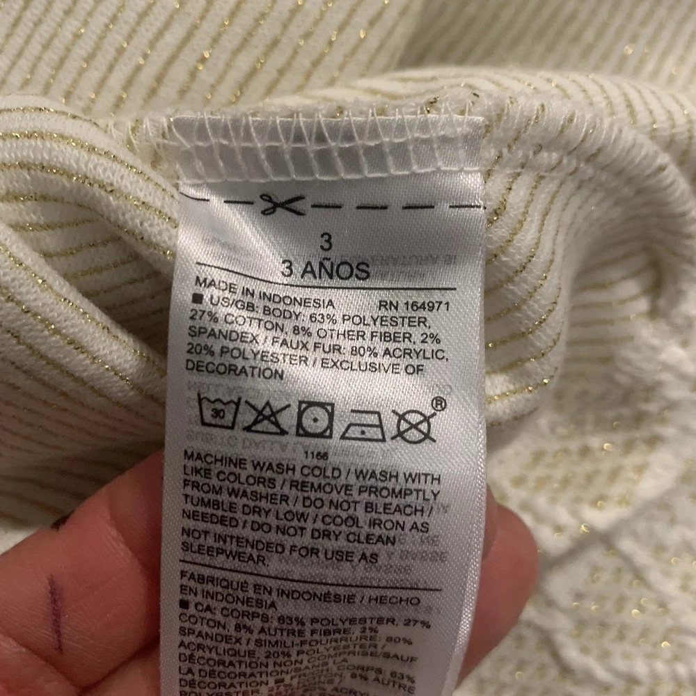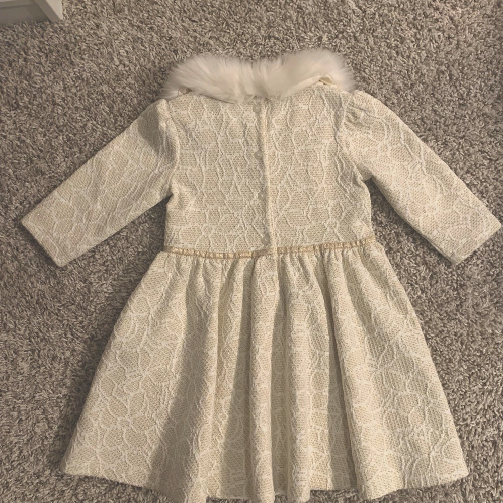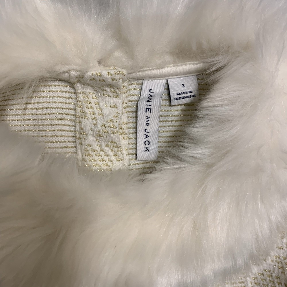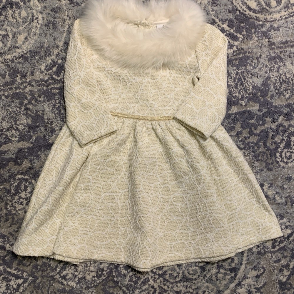 The Janie and Jack Girls 3T Ivory Gold Fit & Flare Dress is a stylish and elegant choice for your little one, perfect for special occasions like parties or formal events. The dress features a geometric pattern in gold, with a faux collar and puff sleeves for a sophisticated look. Made from polyester knit fabric, this knee-length dress is easy to care for with machine washable instructions. The dress is accented with fur trim, metallic thread, and button closures, making it a festive and charming option for your daughter's wardrobe, suitable for all seasons.