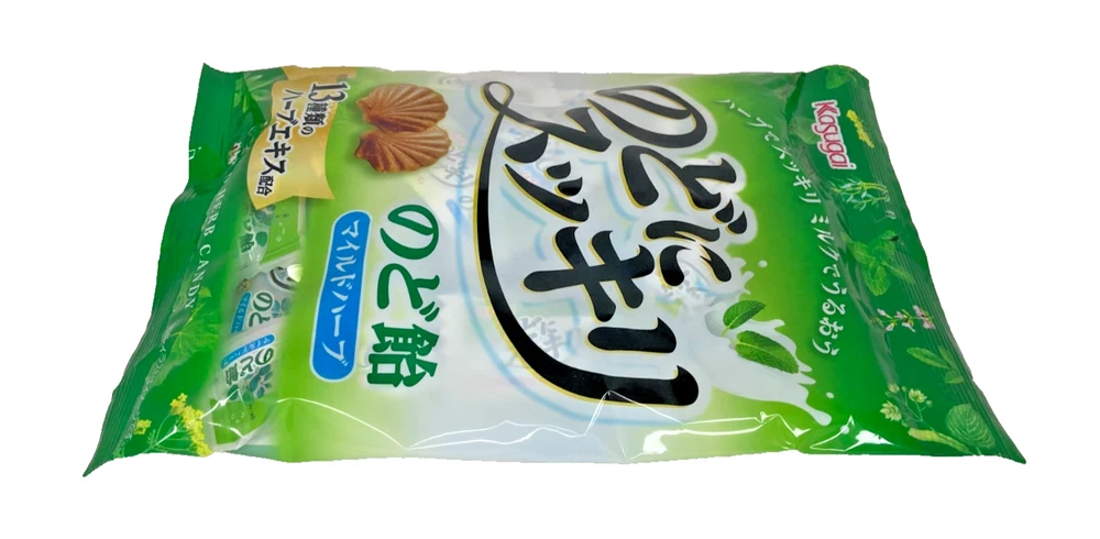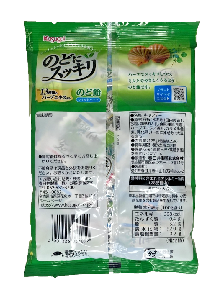 Regional Cuisine/Region: Japanese Product: Candy Flavor: Milk Herb Flavor Packaging: Bag Allergens: Milkingredients, Soybeans UPC: 4901326037052 Type: Throat Candy Occasion: Everyday Item Weight: Approx. 1500g Serving Size: 125g/ 1 bag Brand: Kasugai Number of Servings: 12 Food Specifications: Contains 13 Herbal Extracts gtin13: 4901326037052 Food Aisle: Pantry Expiration Date: More than 180 days MPN: Does Not Apply Calories per 100 g/mL: 398 Kcal per 100g Country of Origin: Japan Shape: Shell-shaped