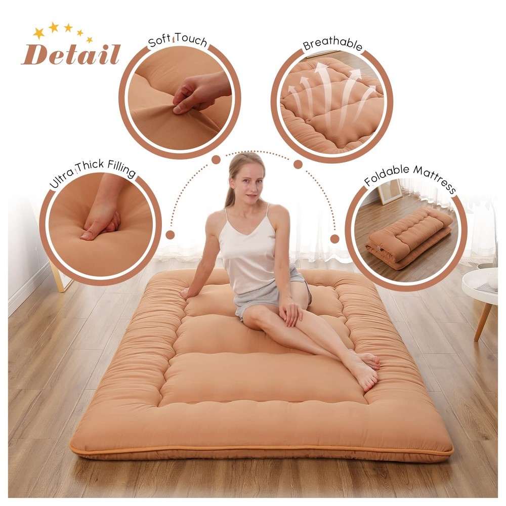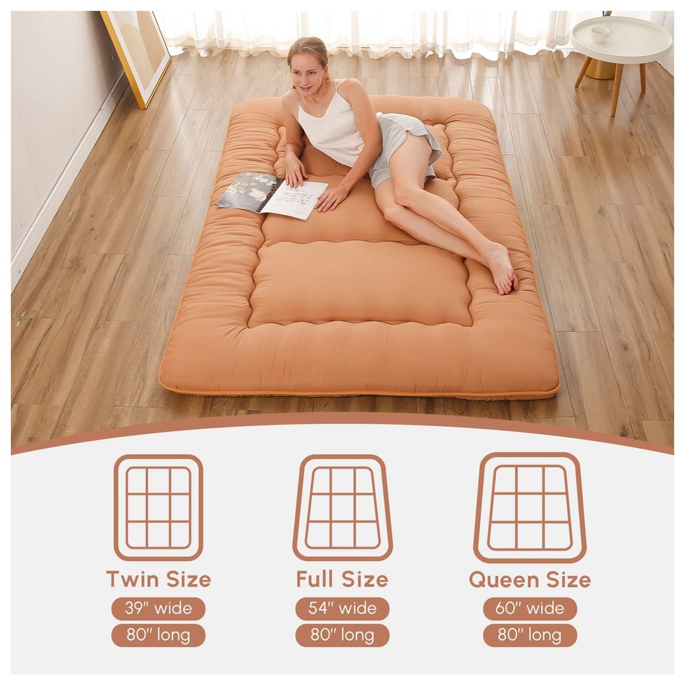 Floor Mattress Important Note: We compress the mattress into a storage bag for simple transportation. When you open the package, there could be some creases on the mattress's surface after opening. Please expose the mattress to the sun for 2-3 days so that it can regain its fluffy form Fabric: Microfiber / Filling Material: Polyester & Memory Foam. Twin Size: 39" wide x 80" long | Weight: 10lbs Care Instructions: Buy a futon mattress, you can get the 1 same color mattress dust-proof cover, 1 pair of bandage, 1 canvas storage bag. With the dust cover, you don't have to wash the entire mattress; simply remove the dust cover and wash it. Simply fold it up and it in the provided storage bag when not in use. It's easy to transport or in a closet or other storage area Excellent Quilting and Comfy Filling: When you sleep, the futon's memory foam can provide adequate support while still allowing for some sinkage. Quilted craftsmanship will ensure even weight distribution without lumps and dips Variety of Uses: The floor mattress can be used as a futon in the bedroom, a living room futon, a tatami mat, a floor mattress, a sleeping floor mat, a tent mat, a guest mattress, or a Japanese bed mat. And you may take it with you everywhere you go in your car