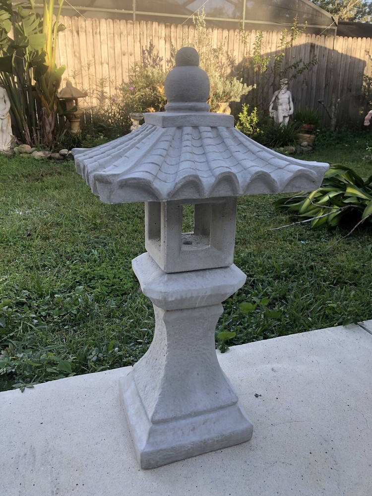 Add a touch of Japanese elegance to your garden with this beautiful pagoda lantern. Made of durable cement and concrete, this weatherproof statue is perfect for both indoor and outdoor use. Measuring 28” tall comes in three parts ! Roof , cube, base. Ships in two boxes ! Ground service only ( UPS or FedEx , it features a classic pagoda shape with intricate Oriental details. Ideal for decorating your porch, flower bed, or lawn, this gray lantern statue is a great addition to any Japanese-themed garden. Its unique design and high-quality materials make it a standout piece that will enhance the overall look of your outdoor space. Made in the United States, this lantern statue is a must-have for any home or garden enthusiast who wants to add a touch of sophistication to their property.