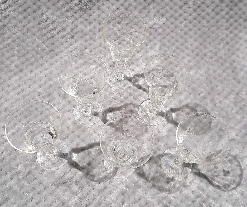 Type: Cordial & Liqueur Glasses Production Style: Elegant Glass Color: Clear Signed: No Features: Etched Care Instructions: Hand Wash Only Department: Unisex Adults Style: Mid-Century Modern Brand: Radio Original/Licensed Reproduction: Original Pattern: Etched Patterns Material: Glass, Crystal Handmade: No Occasion: All Occasions Country/Region of Manufacture: Japan Time Period Manufactured: 1960-1969