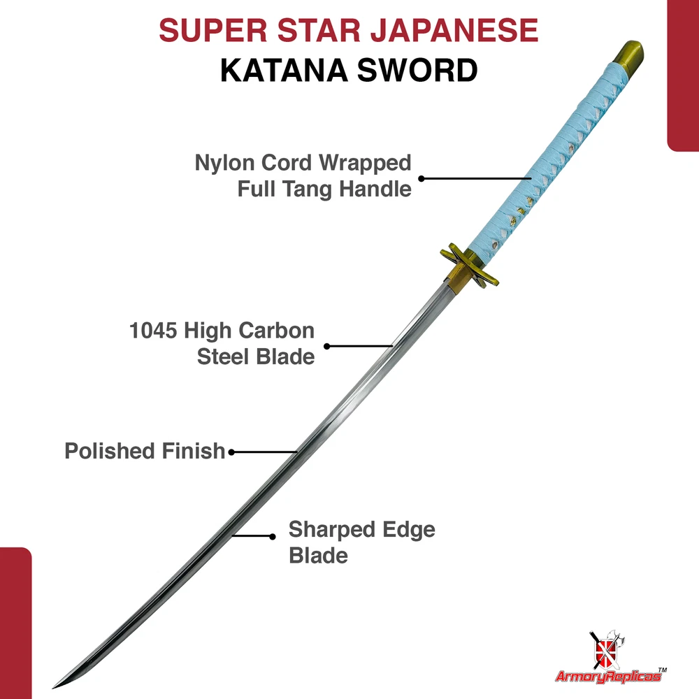 Black Katana With an overall length of 39 INCHES, a handle length of 11.5 INCHES, and a blade length of 27.5 INCHES, this foam katana strikes the ideal balance between authenticity and convenience, making it perfect for cosplay, theatre, and other events. Black Ninja Katana Standing at an overall length of 42.5 inches, with a 31.5-inch blade and a handle length of 11 inches, the sword showcases authentic proportions for a true Japanese Ninja Katana experience. The guard dimensions of 4 x 3 inches and an inner core of 10mm contribute to its realistic feel. Cosplay Katana-Black with Belt The pommel has a black chain decoration that measures, 75 inches long. Case Overall Length: 12.25 Inches, Case Material: Nylon Cosplay Katana-blue Measuring at 39 inches overall, with a handle length of 11.5 inches and a 27.5-inch blade, this foam katana perfectly replicates Hitsugaya's Hyorinmaru. Ideal for LARP, costume parties, cosplay events, theatre performances, and more. Real Katana-Black 68" Dive into the Details with Precision Specifications - an Overall Length of 68 Inches (in Scabbard), a 48-Inch Blade, and a 1.25-Inch Blade Width. The 3mm Thickness Guarantees Strength, While the 16-Inch Handle Adds Balance and Control to This Formidable Katana. Real Katana-Blue 41" Experience the traditional Japanese craftsmanship with a heat-tempered 28.5-inch blade showcasing an authentic Hamon, created using a fast cooling method. The Hi or Blood Groove adds balance and maneuverability. Real Katana-White 38" Measuring at 38 inches overall, with a 26.25-inch carbon steel blade and an 11.75-inch handle, our katana is designed exclusively for decorative and display purposes, featuring a Manji Guard for added aesthetic appeal. Real Katana-White Snow 41" Measuring 41 inches overall with a 26-inch blade, 15-inch handle, and featuring intricate details, this decorative katana is ideal for showcasing your love for anime, making it a must-have for collectors and fans alike. Real Katana-white 40.75" With an overall length of 40.75 inches, a 26-inch blade, and a handle length of 14.75 inches, this replica katana boasts a substantial presence. The 3.75mm blade thickness ensures durability, making it a standout addition for enthusiasts and collectors alike. Real Steel Katana-Black 40" Whether you're a collector or attending conventions, this katana is a must-have. With an overall length of 40 inches and a high-gloss black blade, it's not just a sword ? it's a statement piece that resonates with millennial style. Plus, it comes complete with a hardwood sheath for convenient storage and transport. White Katana With an overall length of 39.25 inches, a handle length of 11.75 inches, and a 27.5-inch blade, our foam katana mirrors the proportions of the anime original, offering a striking visual impact at conventions and gatherings.