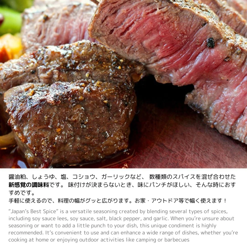 Soy sauce spice for BBQ This versatile seasoning, created by a well-established soy sauce shop, combines several types of spices such as soy sauce lees, soy sauce, salt, black pepper, and garlic. When you’re unsure about seasoning or want to add a little punch to your dishes, this is a great choice. Use it as a flavor enhancer for steaks, stir-fries, yakisoba, fried potatoes, soups, stews, and hot pots. It’s also perfect for outdoor activities like picnics, barbecues, and camping! Product Name: Nihonichi Spice Type of Soy Sauce: Spice Ingredients (Soy Sauce Flavor): Salt (domestically produced), soy sauce, soy sauce lees, black pepper, garlic, chili pepper, paprika powder, onion, turmeric, nutmeg (contains soybeans and wheat in some portions) / Seasonings (amino acids, etc.) Shelf Life: 1 year Storage Method: Store in a place with low humidity, away from direct sunlightBefore opening, seal and store in a dry place, and use as soon as possible. 2.8 oz (80g) Soy sauce spice for BBQ This versatile seasoning, created by a well-established soy sauce shop, combines several types of spices such as soy sauce lees, soy sauce, salt, black pepper, and garlic. When you’re unsure about seasoning or want to add a little punch to your dishes, this is a great choice. Use it as a flavor enhancer for steaks, stir-fries, yakisoba, fried potatoes, soups, stews, and hot pots. It’s also perfect for outdoor activities like picnics, barbecues, and camping! Product Name: Nihonichi Spice Type of Soy Sauce: Spice Ingredients (Soy Sauce Flavor): Salt (domestically produced), soy sauce, soy sauce lees, black pepper, garlic, chili pepper, paprika powder, onion, turmeric, nutmeg (contains soybeans and wheat in some portions) / Seasonings (amino acids, etc.) Shelf Life: 1 year Storage Method: Store in a place with low humidity, away from direct sunlightBefore opening, seal and store in a dry place, and use as soon as possible.