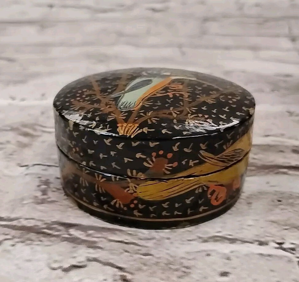 This beautifully crafted trinket box is a must-have for collectors of all things decorative. The round shape and lacquered finish give it a unique and elegant look that is sure to catch the eye. The box features a stunning bird design, perfect for those who love boxing or any other sport. It comes boxed and is ready for display or use. The brand is Bird and it is made of high-quality materials, ensuring its durability. This trinket box is a great addition to any collection and is sure to be a conversation starter.