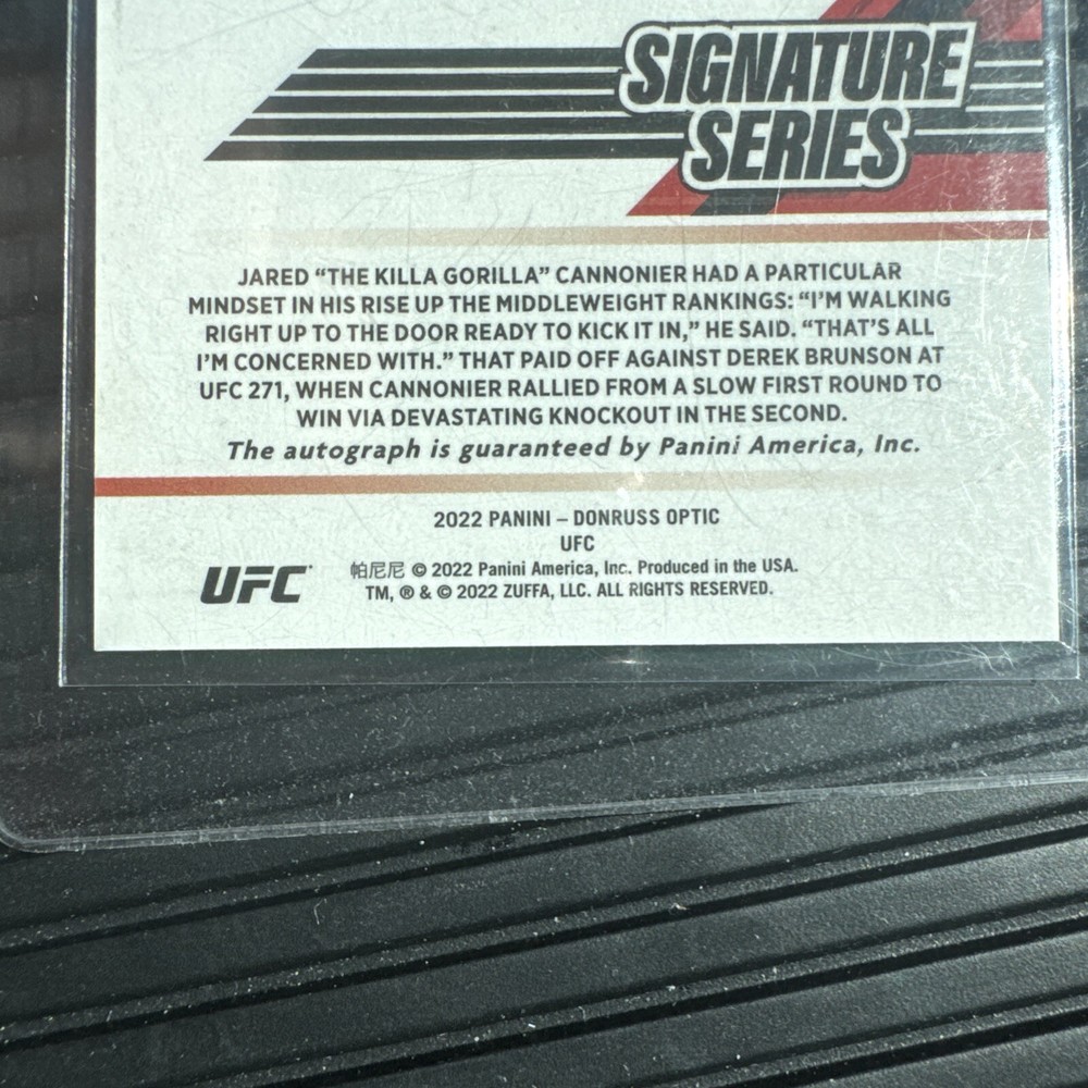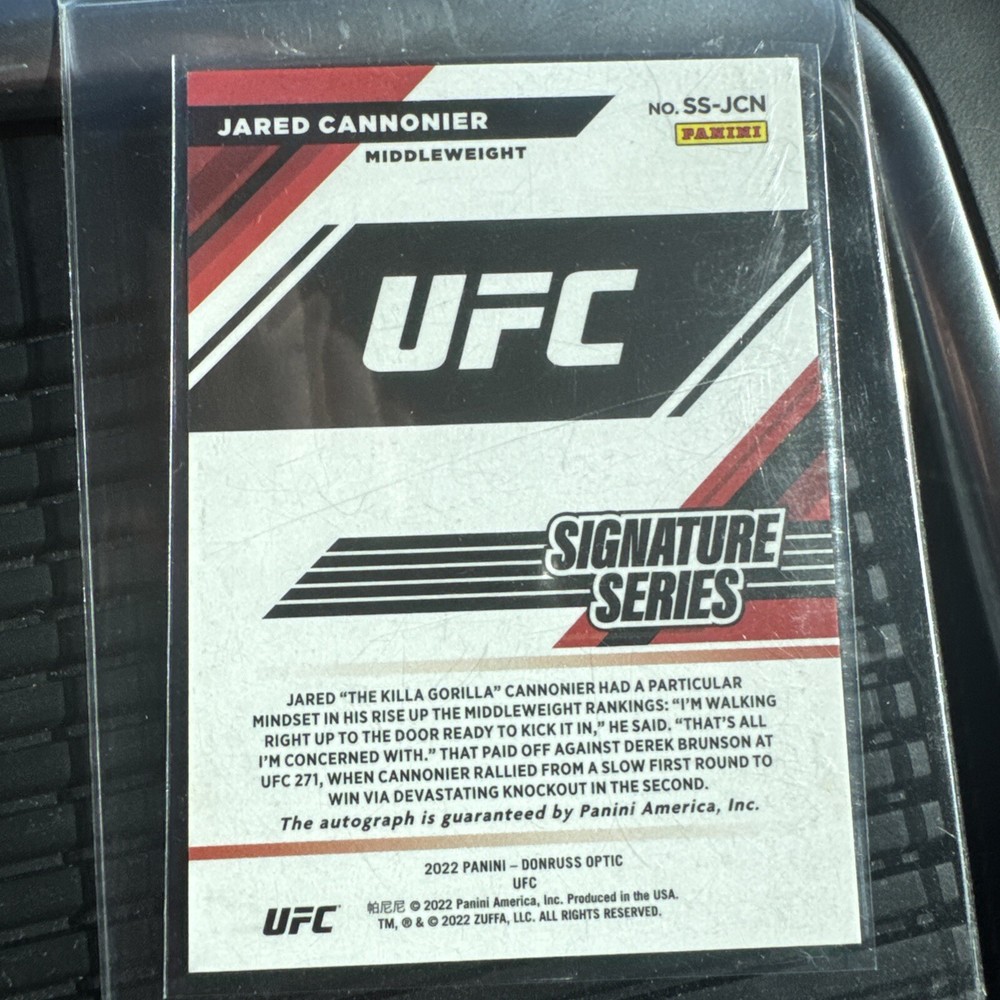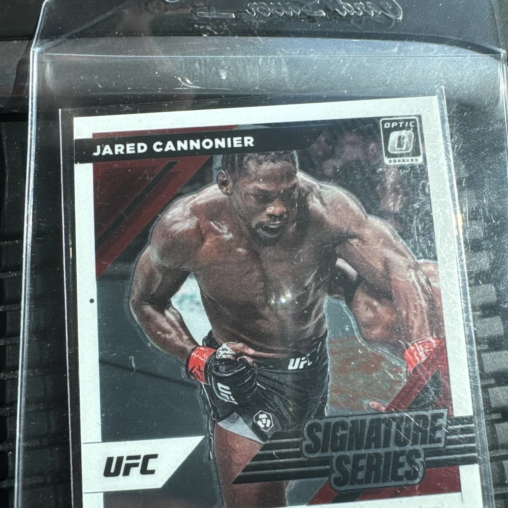 Capture a piece of Mixed Martial Arts history with the Jared Cannonier 2022 Donruss Optic UFC Signature Series Auto card, numbered SS-JCN. This collectible card features the talent behind the Octagon's power plays, Jared Cannonier, and is a must-have for UFC enthusiasts and sports card collectors alike. Part of the prestigious 2022 Donruss Optic UFC series, it showcases the quality and design collectors have come to expect. Autograph collectors will be pleased to note that while this card is not autographed, it stands out for its pristine presentation and the rarity of the Signature Series insert. Crafted in the United States, this card is a testament to Cannonier's impact on the sport, and it's a fine addition to any collection celebrating the Ultimate Fighting Championship.