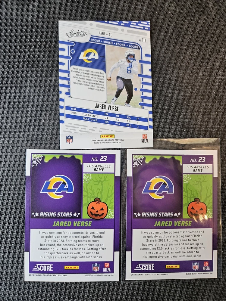 Set: 2024 absolute, 2024 score Player/Athlete: Jared Verse Features: Rookie, Insert Number of Cards: 3 Team: Los Angeles Rams League: National Football League (NFL) Sport: Football Season: 2024 Type: Sports Trading Card Manufacturer: Panini Year Manufactured: 2024