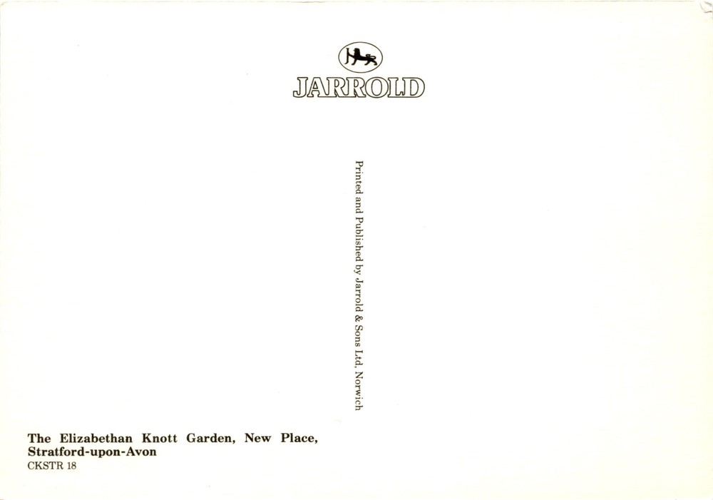 MAKE AN OFFER. THE MORE YOU BUY THE BETTER DEAL I WILL ACCEPT The postcard was printed and published by Jarrold & Sons Ltd in Norwich. The image on the front shows the Elizabethan Knott Garden at New Place in Stratford-upon-Avon. New Place was the final residence of William Shakespeare, purchased in 1597.