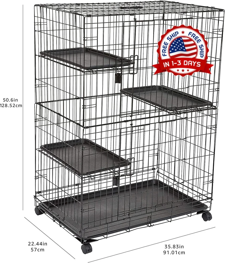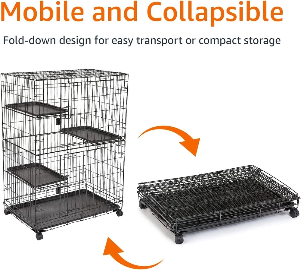 Jaula alta para gatos de 3 niveles para interiores que ofrece a gatos o gatitos un lugar seguro para descansar o jugar. Construcción duradera de alambre de acero resistente a la oxidación con pestillos de seguridad en la puerta y 3,4 cm de espacio entre las barras para mayor seguridad. Se monta rápidamente; 4 ruedas con bloqueo para maniobrar con suavidad y colocarlo de forma segura; se pliega completamente para facilitar su transporte y un almacenamiento compacto. 2 puertas abatibles para facilitar el acceso interior superior e inferior; 3 estantes interiores ofrecen espacio vertical para posarse o echarse una siesta; Base de plástico extraíble a prueba de fugas para una limpieza fácil. Dimensiones del producto: 90 x 57 x 127 cm (largo x ancho x alto).