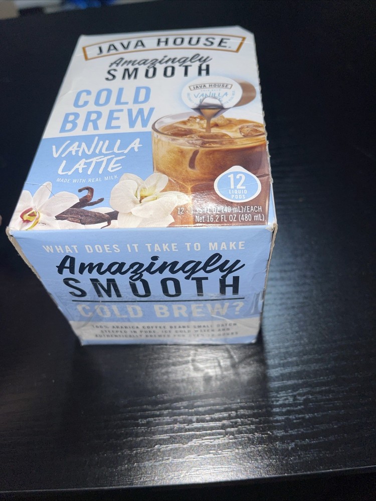 The Java House Cold Brew Coffee Vanilla Latte is a set of 12 liquid pods, each weighing 1.35 oz and with an expiration date of July 2025. This cold brew coffee is infused with a rich vanilla flavor, making it a delicious and convenient option for coffee lovers. Designed for use in a cold brew coffee maker or French press, this pantry item is perfect for enjoying a smooth and flavorful latte anytime.