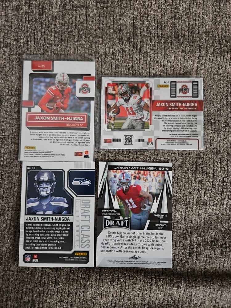 This Jaxon Smith Njigba 2023 RC Lot 4 is a must-have for any football trading card collector. The set includes cards from the 2023 contenders, 2023 contenders optic, 2023 donruss optic, and 2023 leaf draft, featuring the talented player in his rookie season. With a total of 4 cards, this lot is a great addition to your collection and a perfect way to show your support for the National Football League (NFL). The cards are manufactured by Panini and are of the highest quality. Each card showcases a unique design and features Jaxon Smith Njigba in action. This lot is perfect for fans of the sport and collectors alike, and is sure to be a prized possession for years to come.
