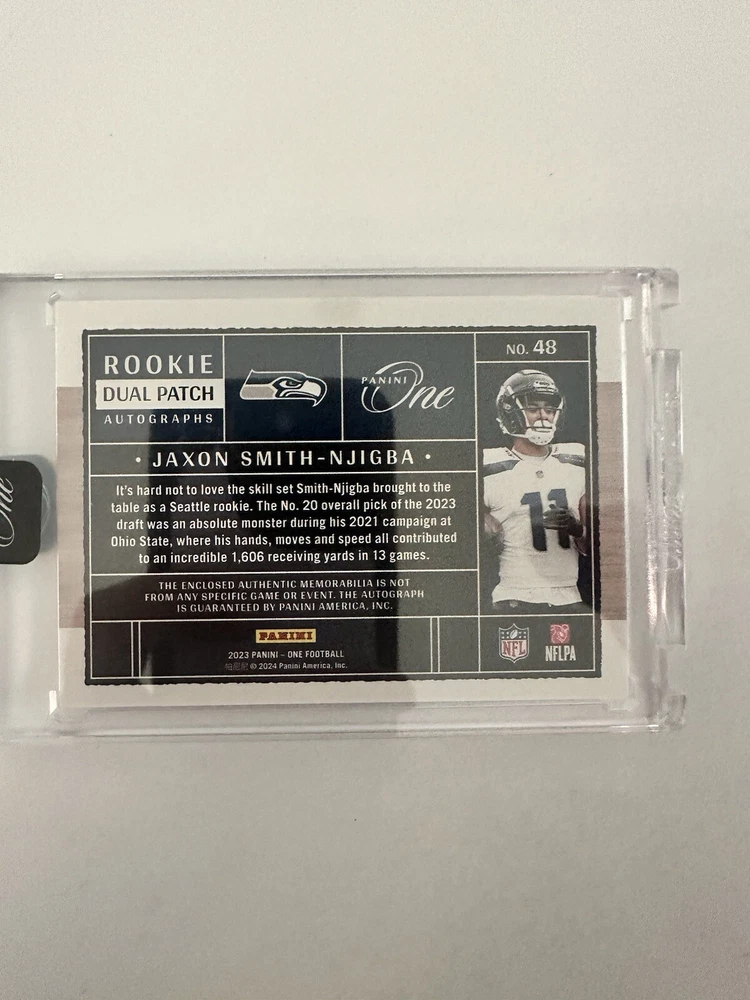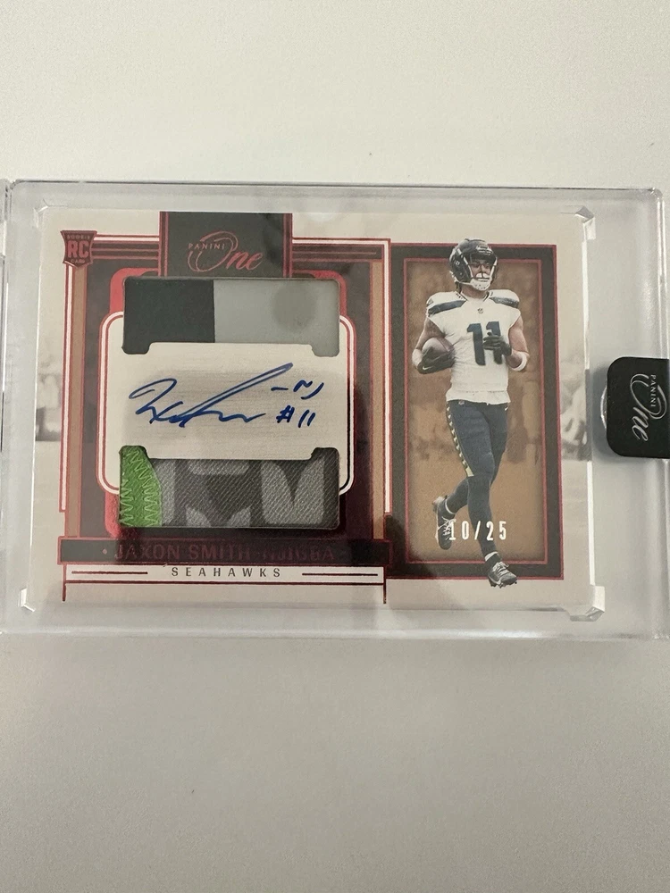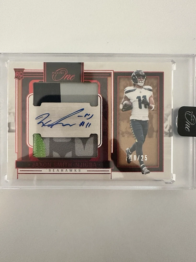 Jaxon Smith-Njigba 2023 Panini One Rookie Dual Patch Auto Red SSP /25 Sealed. Condition is Ungraded. Shipped with USPS Ground Advantage.