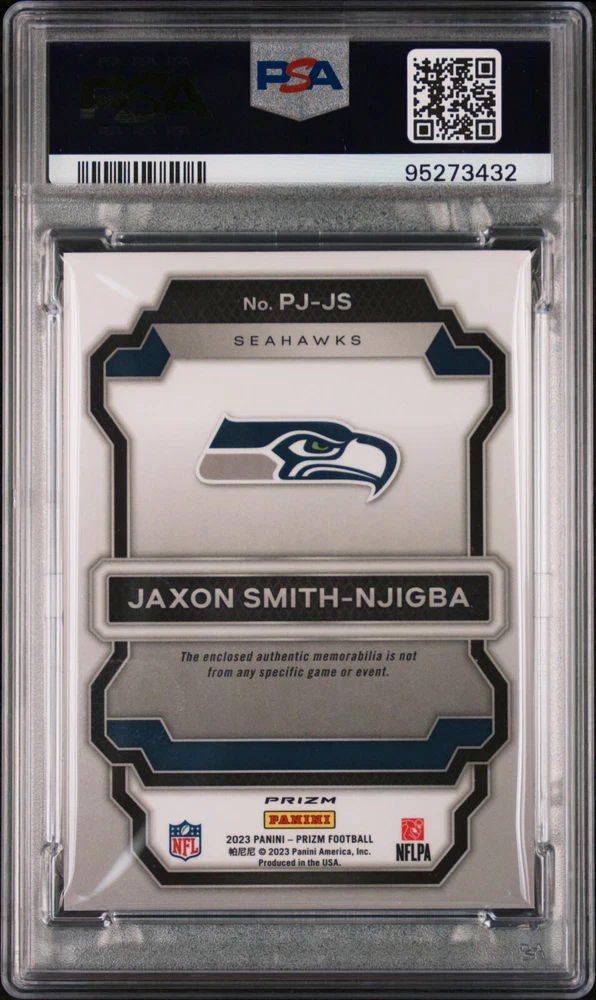 Player/Athlete:Jaxon Smith-NjigbaFeatures:RookieLeague:National Football League (NFL)Parallel/Variety:Purple PulsarSeason:2023Card Number:PJ-JSSet:2023 Panini PrizmManufacturer:PaniniYear Manufactured:2023Autographed:NoTeam:Seattle SeahawksSport:FootballType:Sports Trading CardCountry/Region of Manufacture:Jersey