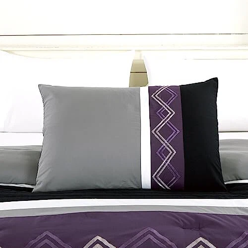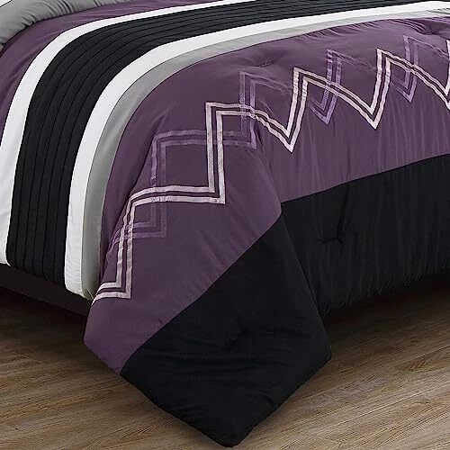 Menu 1. We require immediate payment. 2. We currently accept payment via eBay managed payments only. 3. Once payment is cleared, we will dispatch your shipment within 1-3 business days. Please refer to the "Shipping" tab for more information regarding shipping speed to your destination. Jaxson Bed in a Bag Queen Size 7-Piece Comforter Set with Sheets Modern Pleated Stripe Embroidered Purple/Black/Gray/White Zigzag Lightweight All Season Bedding Product description 7-Piece Bed in a Bag Comforter Set Includes: 1 Comforter, 2 Shams, 1 Flat Sheet, 2 Pillowcases, and 1 Fitted Sheet Queen Size Measurements: Comforter 90" x 92", Shams 20" x 26", Flat Sheet 90" x 102", Pillowcases 20" x 30", Fitted Sheet 60" x 80" +15" Beautiful modern striped design with a twist of chevron pattern with the zigzag embroidery pattern overlapping to add an additional dimension to the design. Included are matching solid color sheet set pieces to easily pair with your décor. The fitted sheets are made with 360 degrees elastic cord with deep pockets to fit mattresses up to 15". Made of 100% polyester, the fabric maintains a super soft and versatile lightweight feel, suitable for year-round use. Easy Care - Machine washable in cold water, tumble dry low, do not bleach Made in OEKO-TEX Standard 100 factory, an independent certification system that stands for customer confidence by ensuring textiles are tested for harmful substances and meets high product safety and environmental standards. PLEASE MESSAGE US IF YOU HAVE ANY OTHER QUESTIONS, AND MANY THANKS FOR READING ALL OF THIS. Copyright ©#. All Rights Reserved.